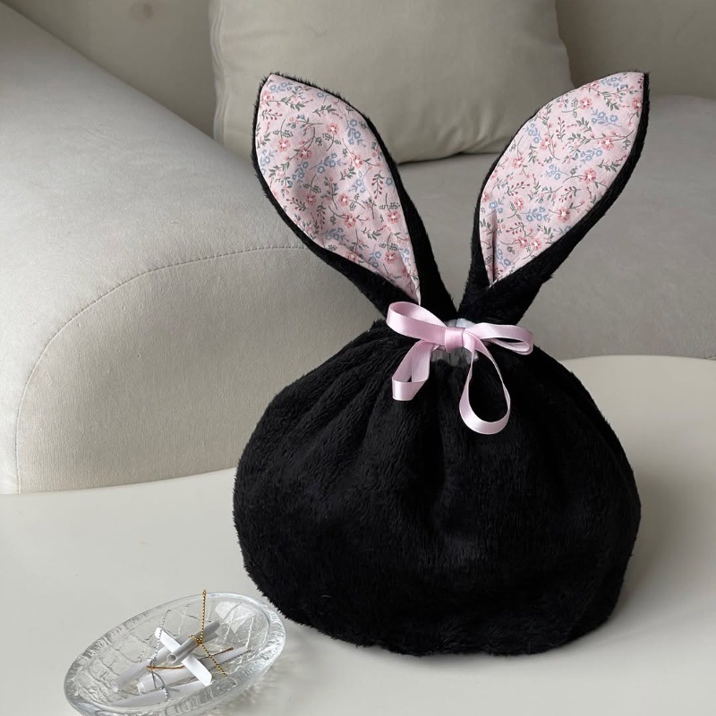 立体的なうさぎ耳がキュートなふわふわ素材の巾着ポーチです。