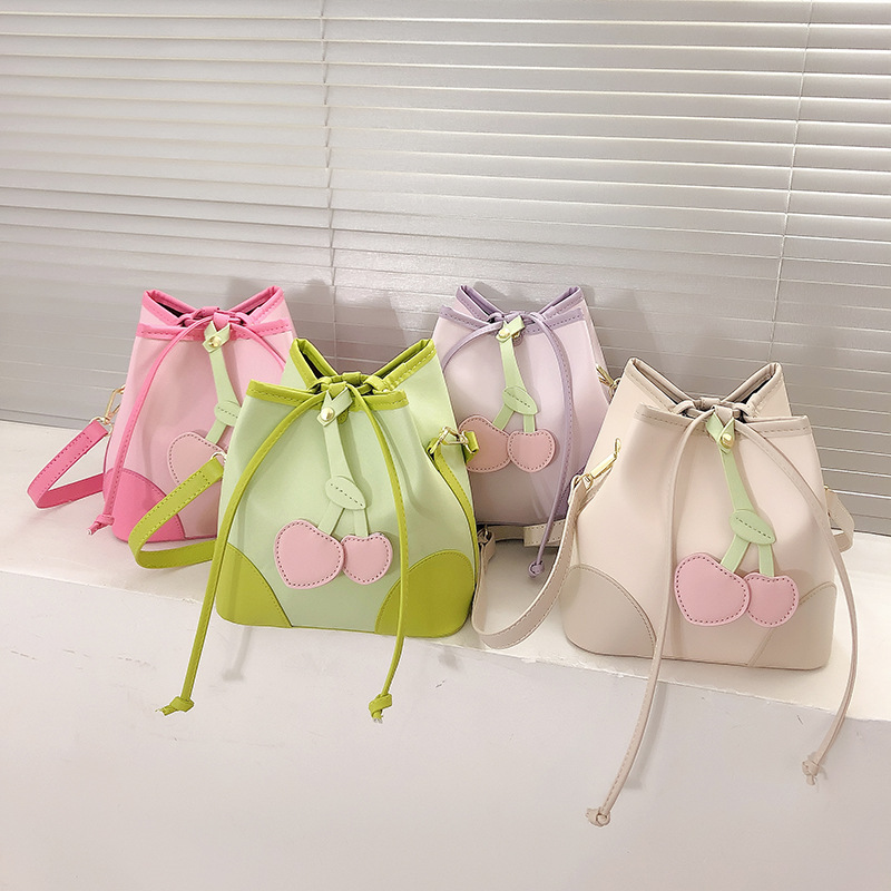 愛らしいさくらんぼの刺繍が施された巾着ショルダーバッグは、持っているだけで気分が明るくなります。