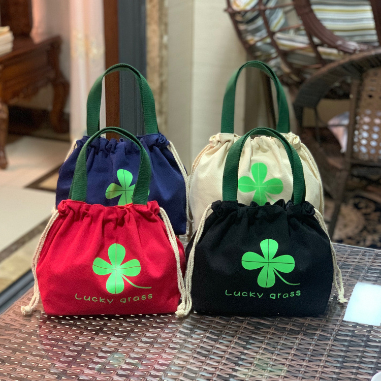 幸運のシンボルである四つ葉のクローバー刺繍が施された巾着ポーチです。