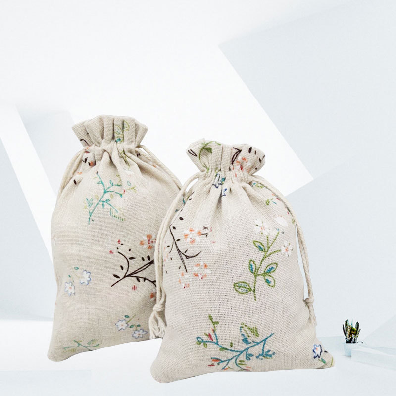 バッグインバッグに最適な花と蝶の刺繍入りナチュラルリネン巾着