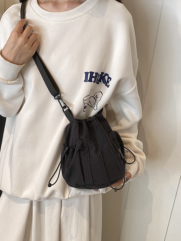 軽量なナイロン素材で作られた巾着型のショルダーバッグは、持ち運びの負担を軽減します。