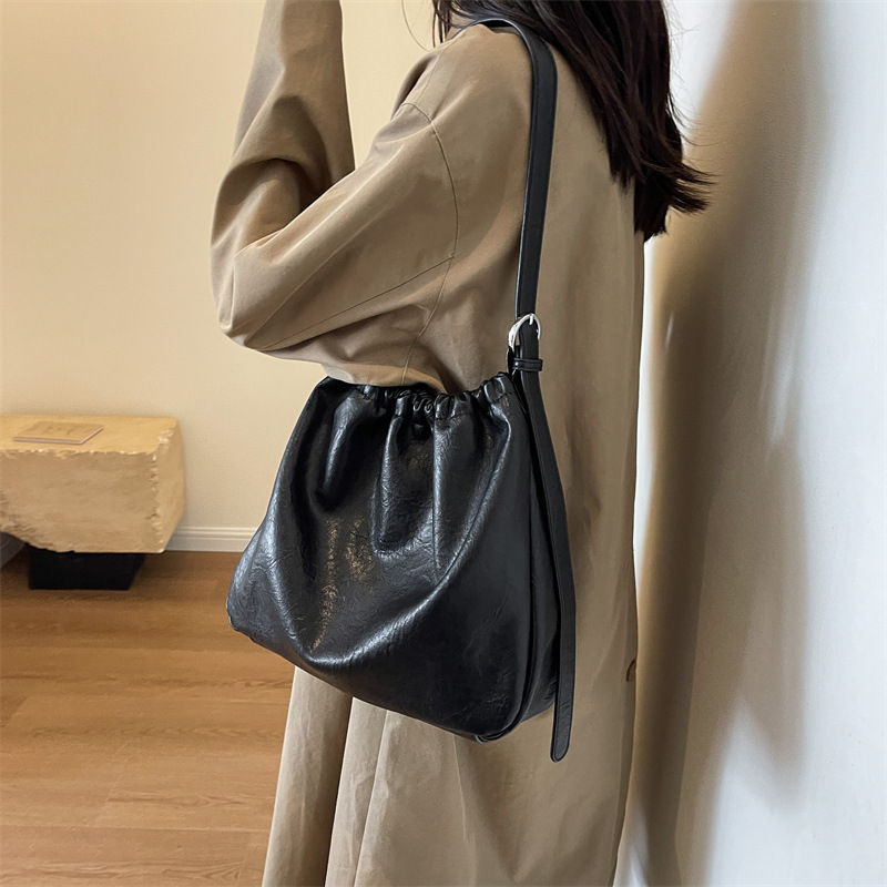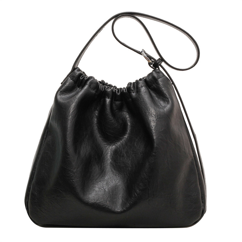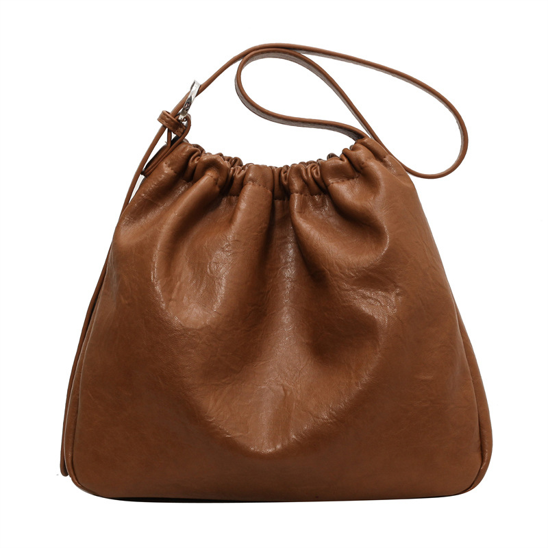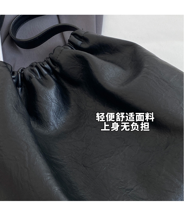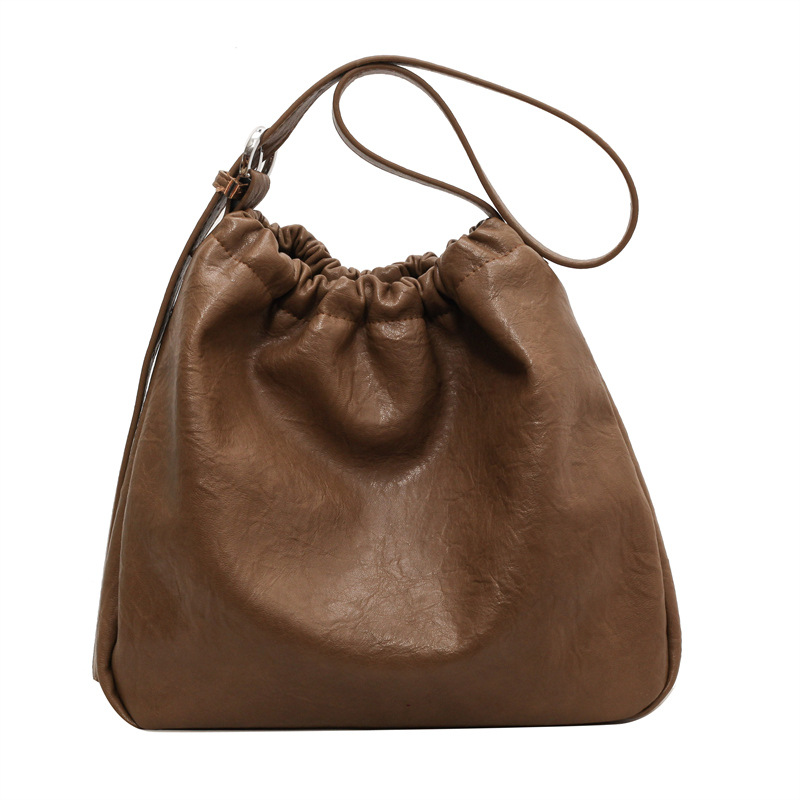 柔らかな質感の合成皮革を使用した巾着デザインのショルダーバッグです。