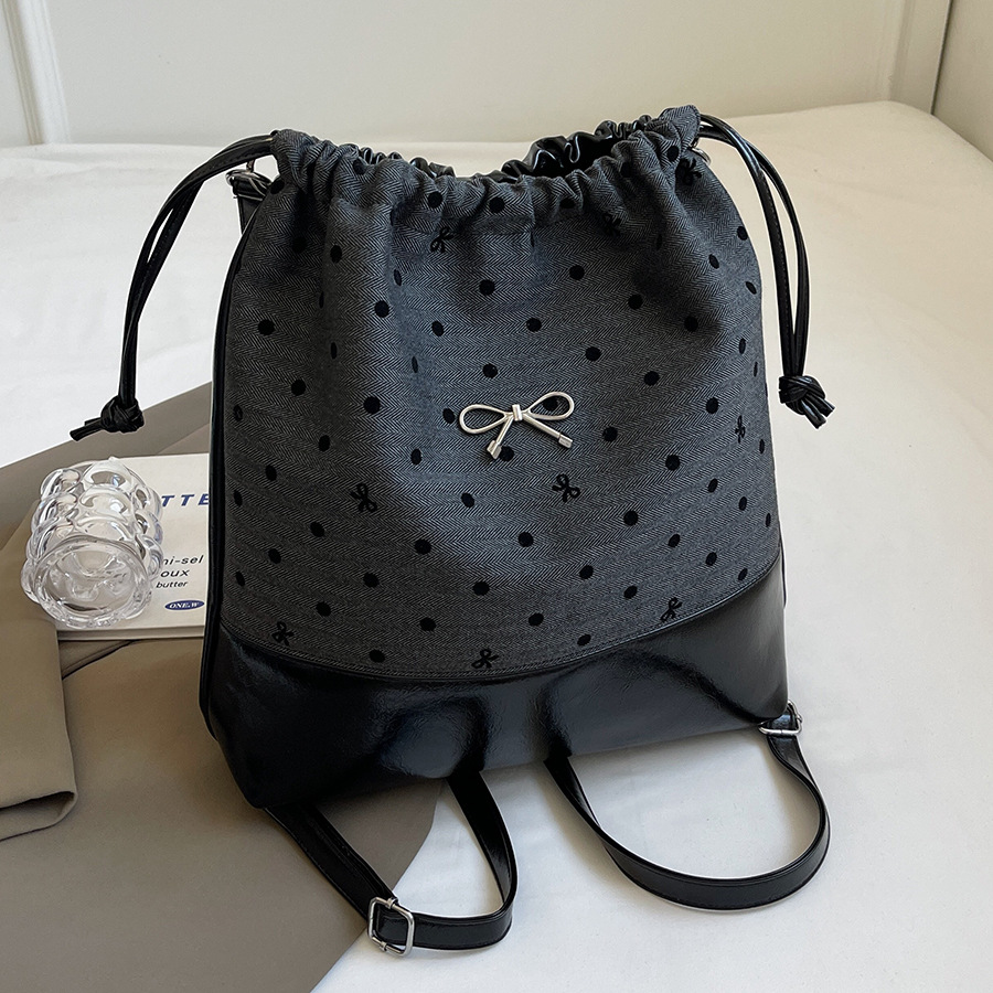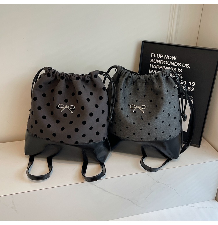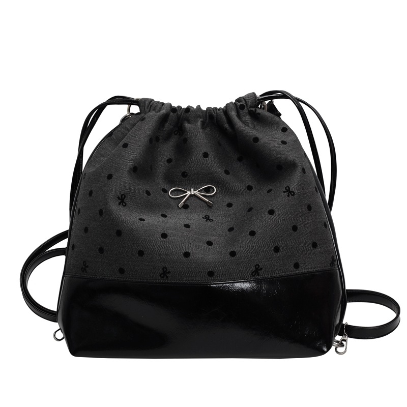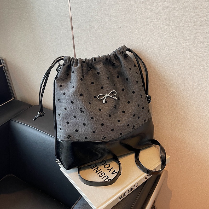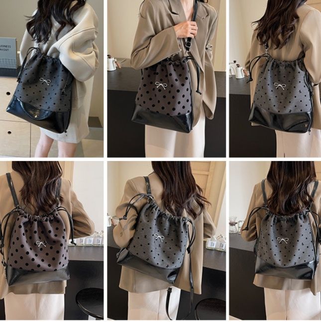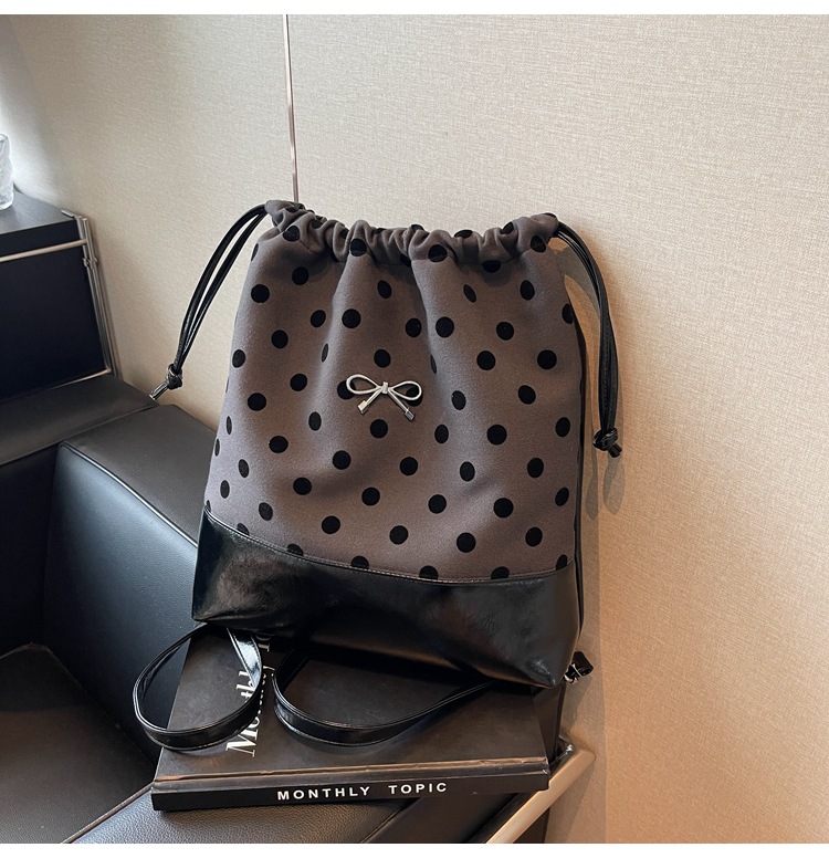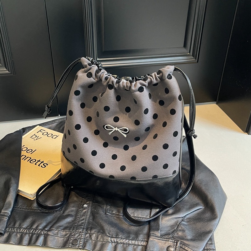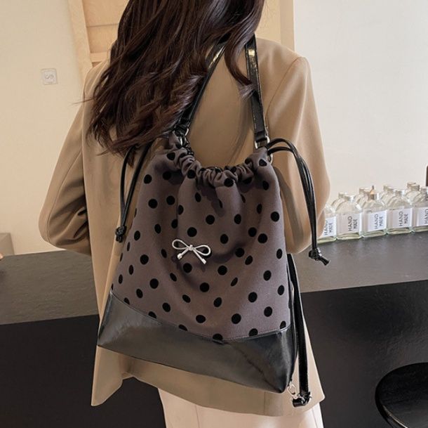 愛らしい水玉模様が全体に施された巾着タイプのショルダー鞄です。