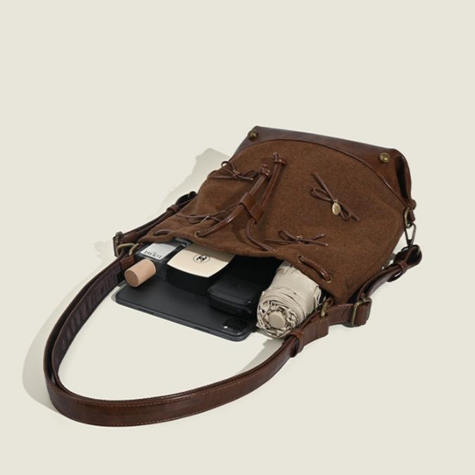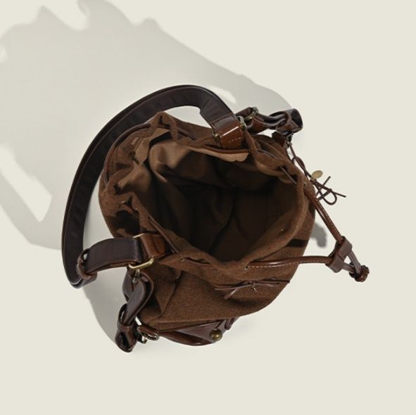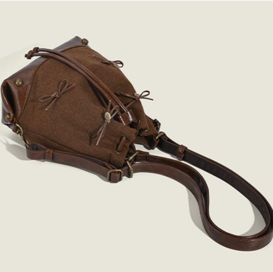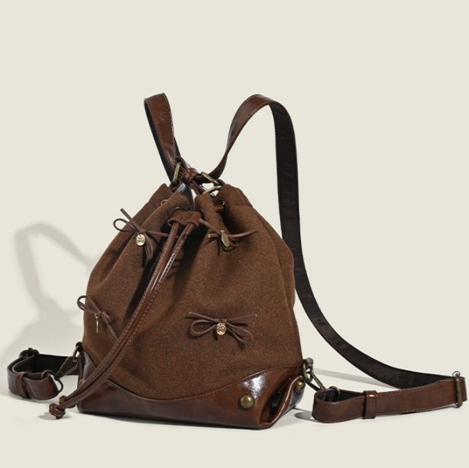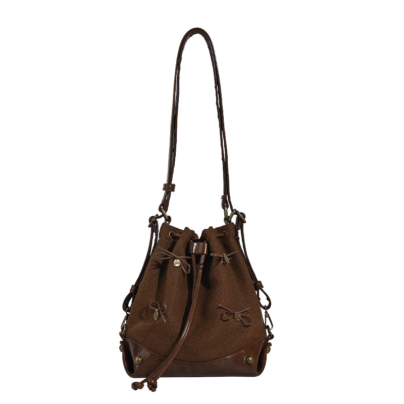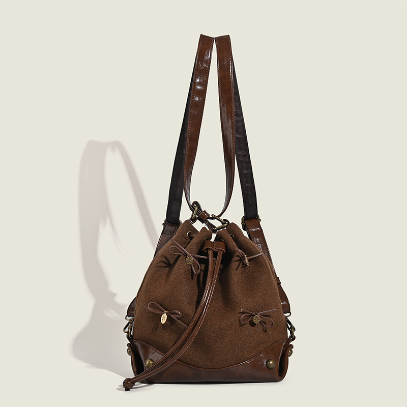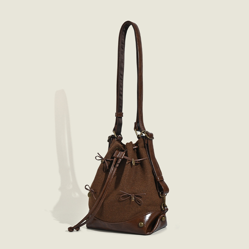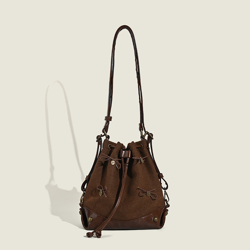上質なスエード調素材と革のコンビネーションが上品な印象を与える巾着タイプのショルダー鞄です。 両サイドに施された可愛らしいリボン飾りがアクセントとなり、女性らしさを演出します。 開口部は紐で開閉できる巾着仕様で、中身をしっかり守りながらも取り出しやすい実用性の高いデザインです。 調節可能なショルダーストラップで斜め掛けも可能で、日常使いからお出かけまで幅広いシーンで活躍します。 底部分には鋲が施されており、床に置いた際の安定感と耐久性も兼ね備えています。