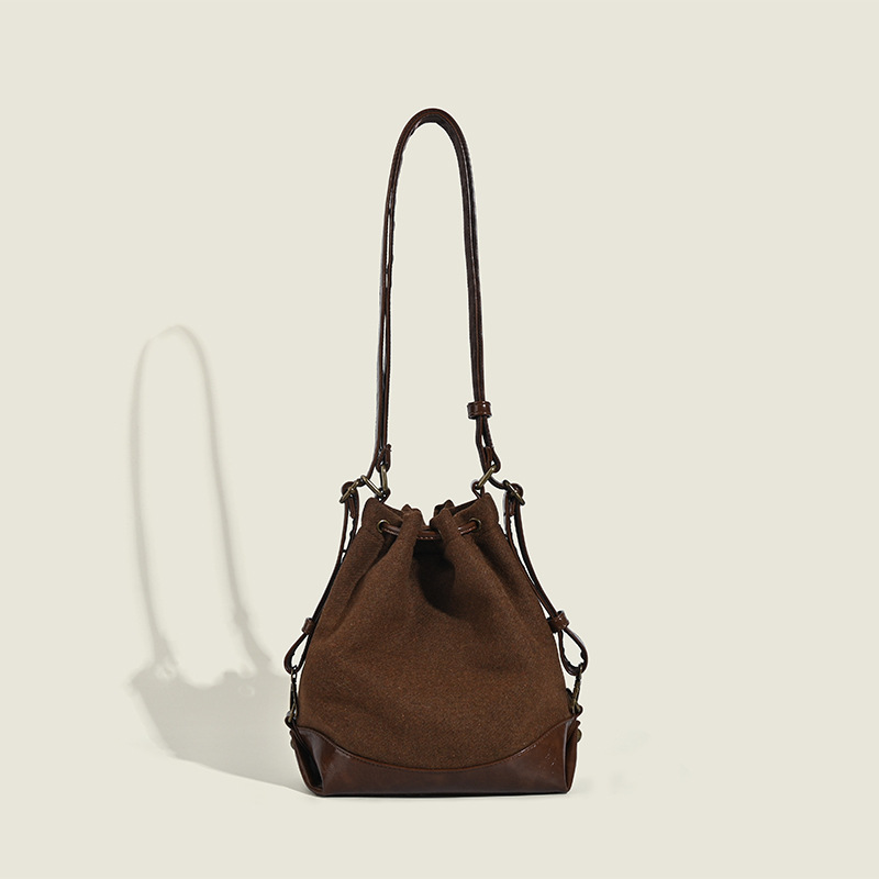 上質なスエード調素材と革のコンビネーションが上品な印象を与える巾着タイプのショルダー鞄です。