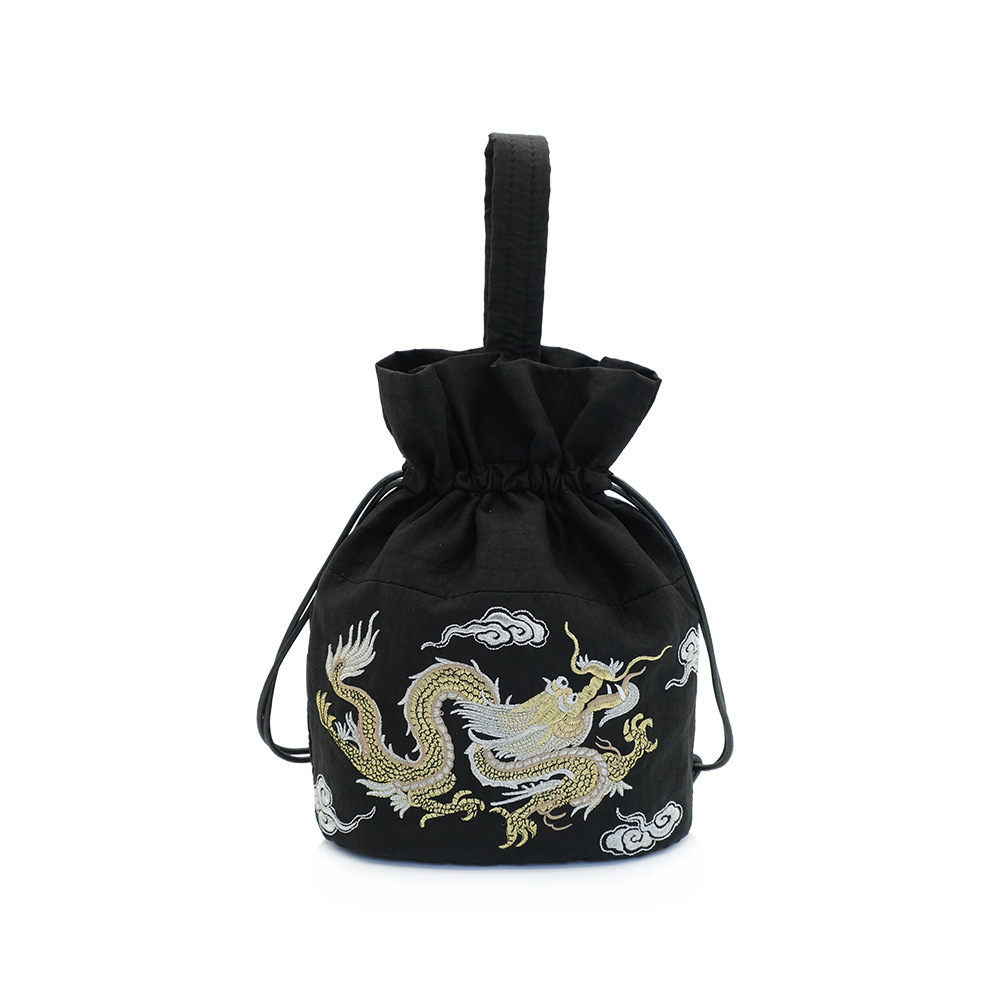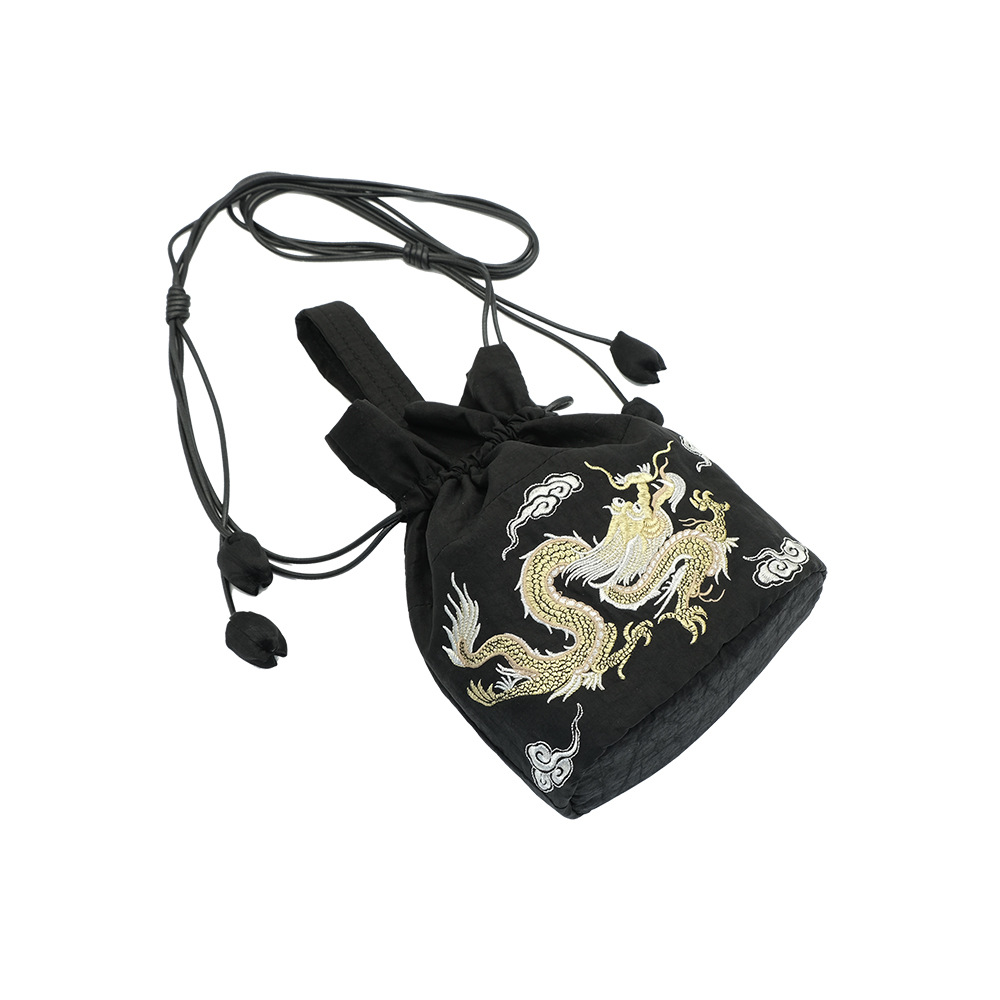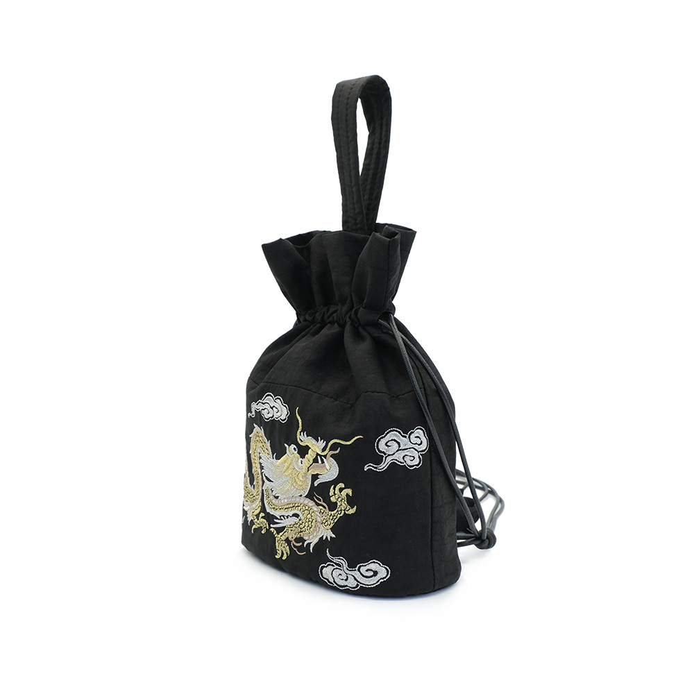 豪華な龍の刺繍が施された、東洋の美を感じる巾着ポーチです。