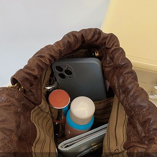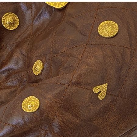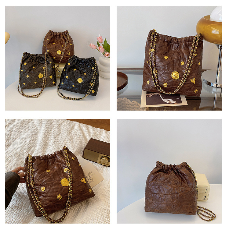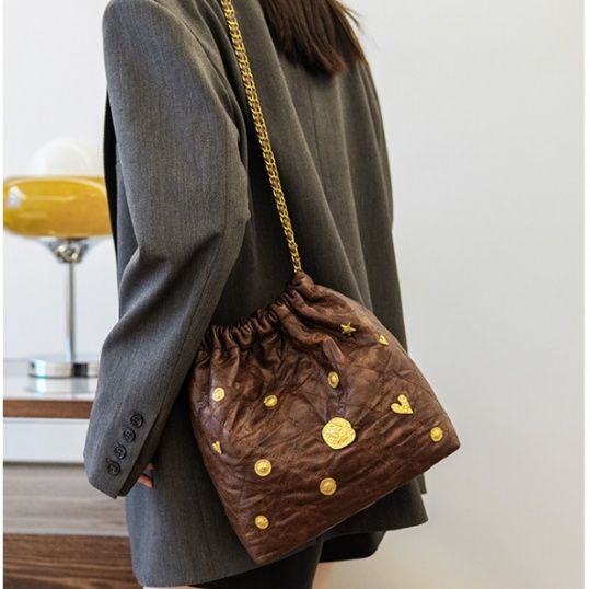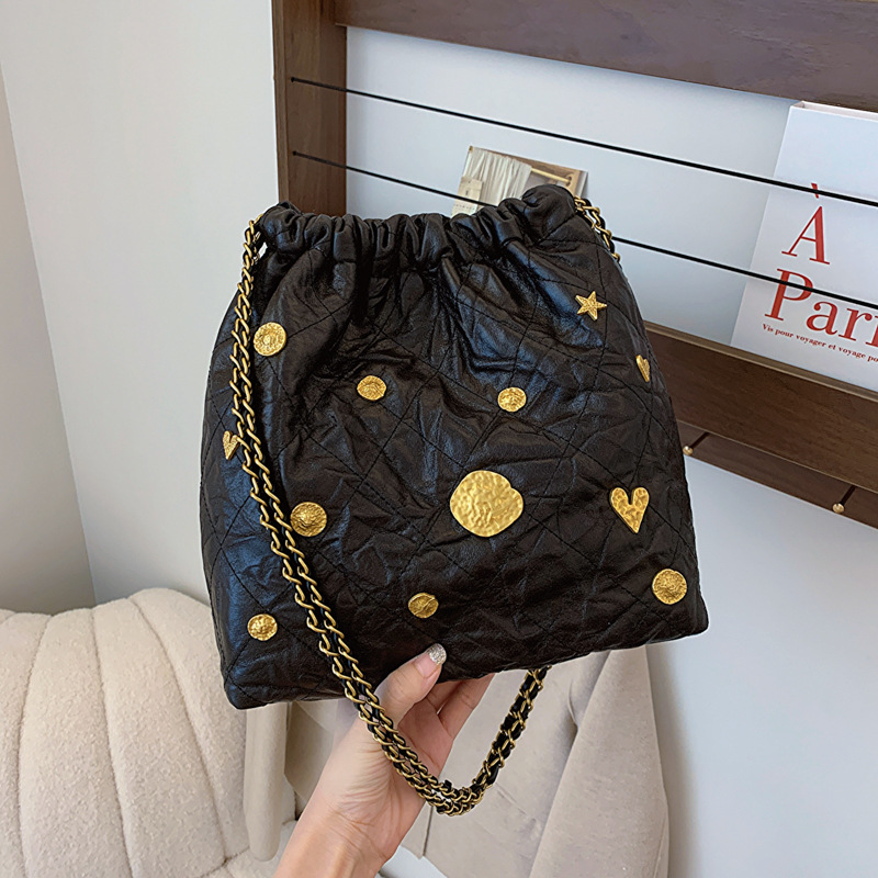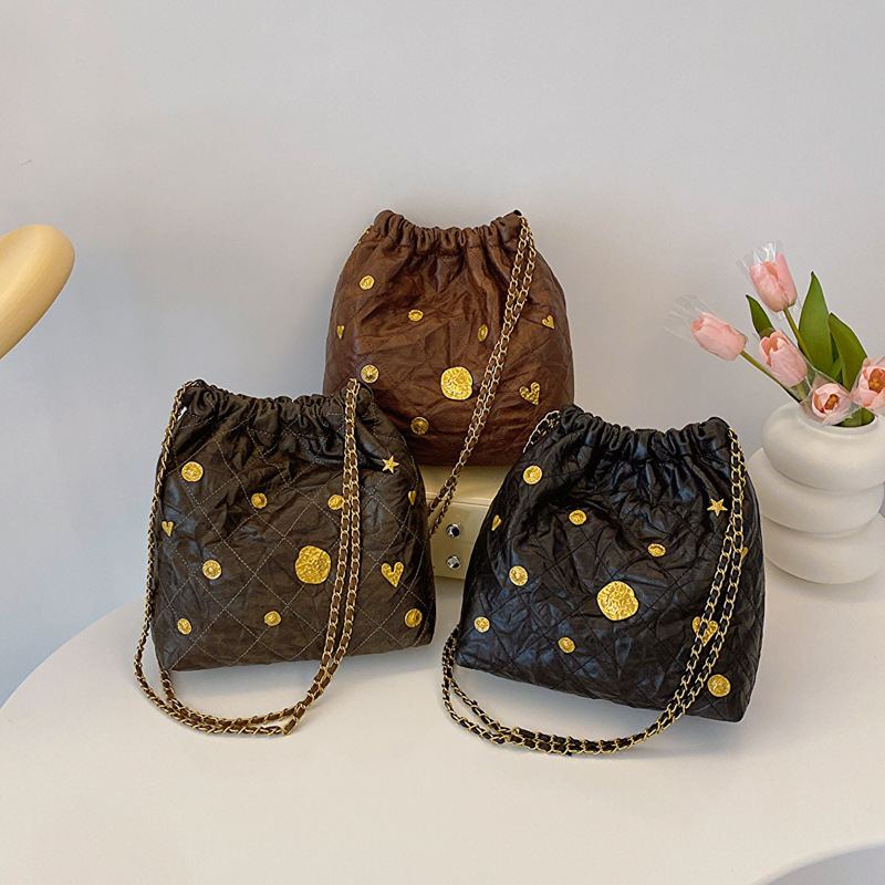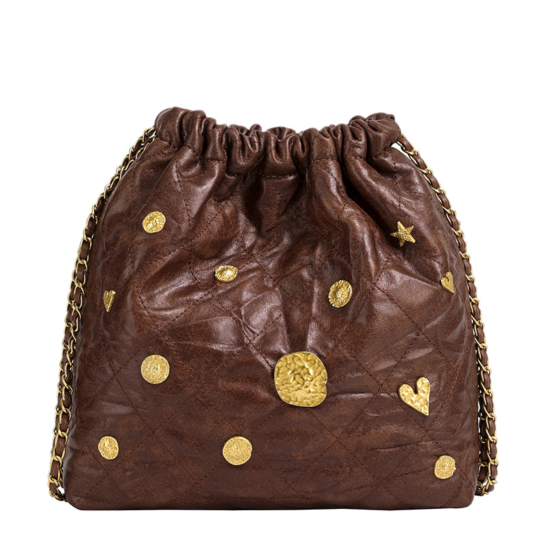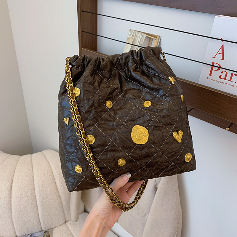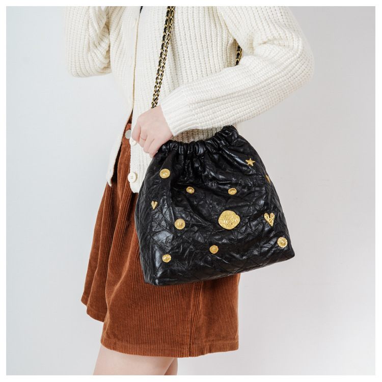 キルティング素材に金色の装飾を散りばめた、華やかな巾着デザインのショルダー鞄です。