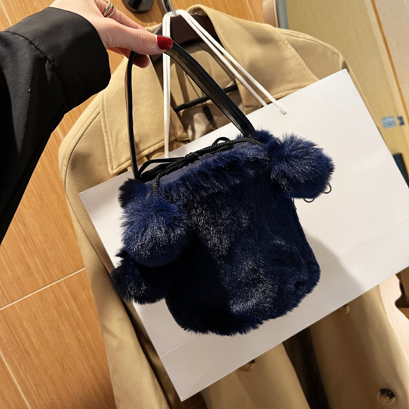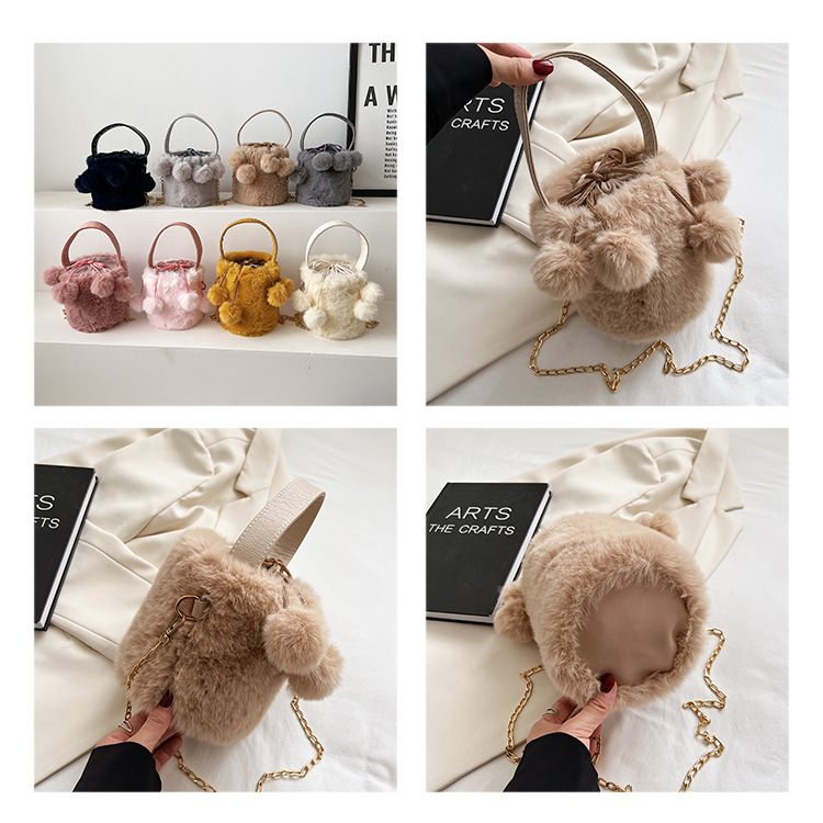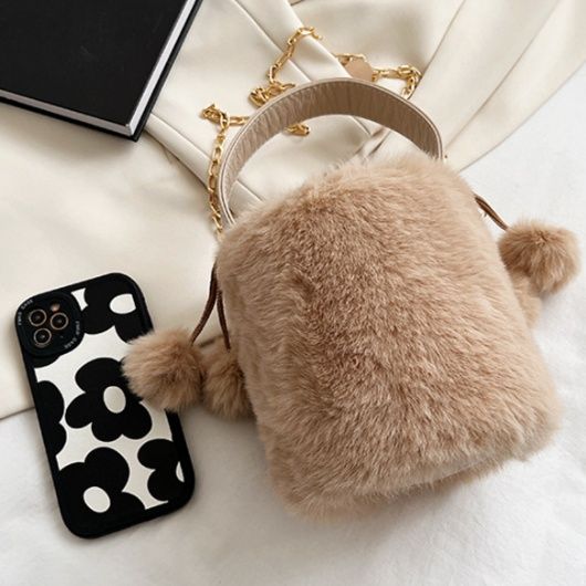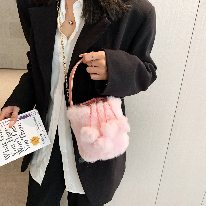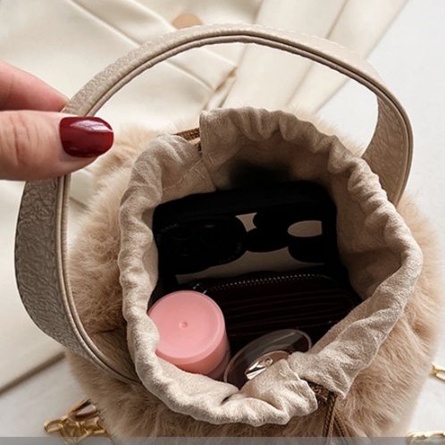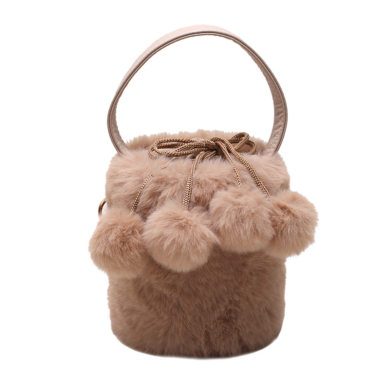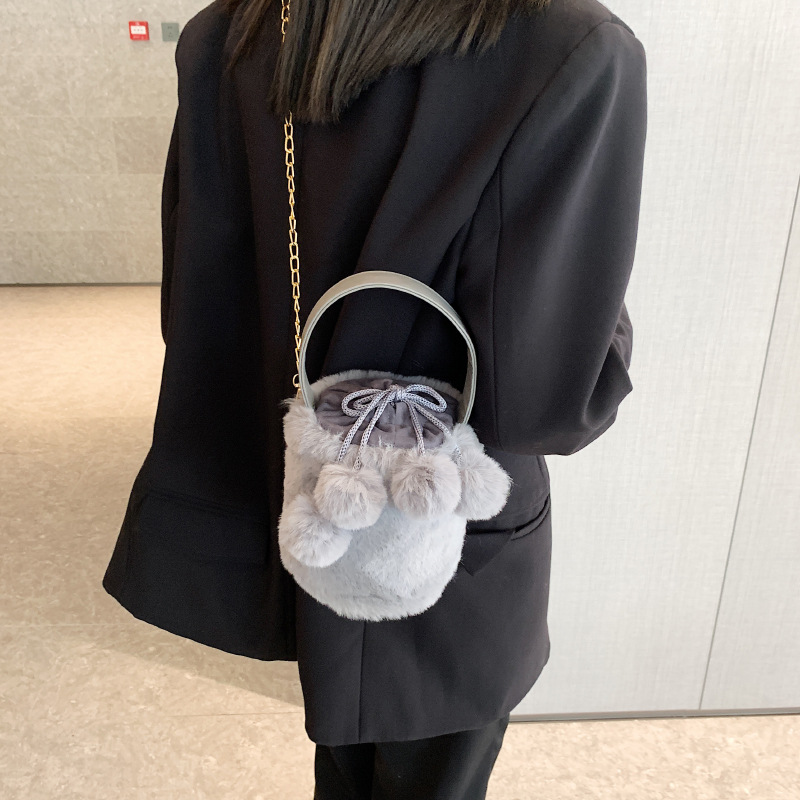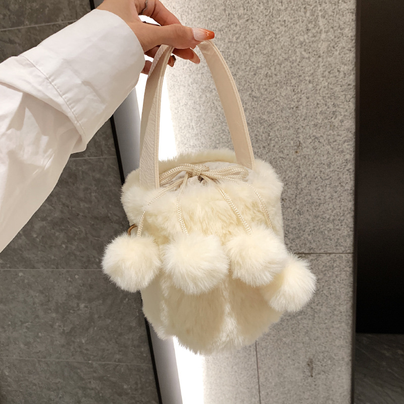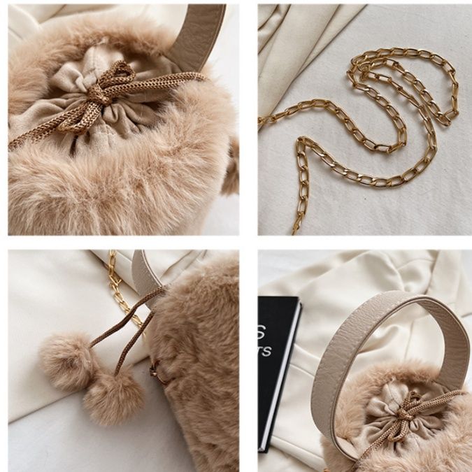 ふわふわのファー素材で作られた、可愛らしい印象の巾着タイプのショルダー鞄です。
