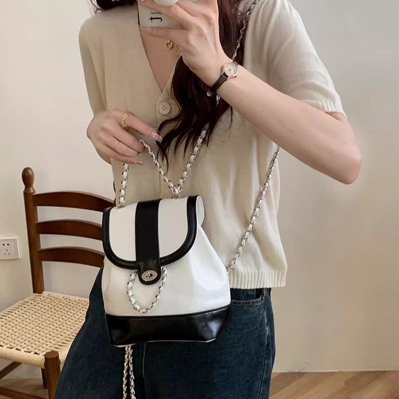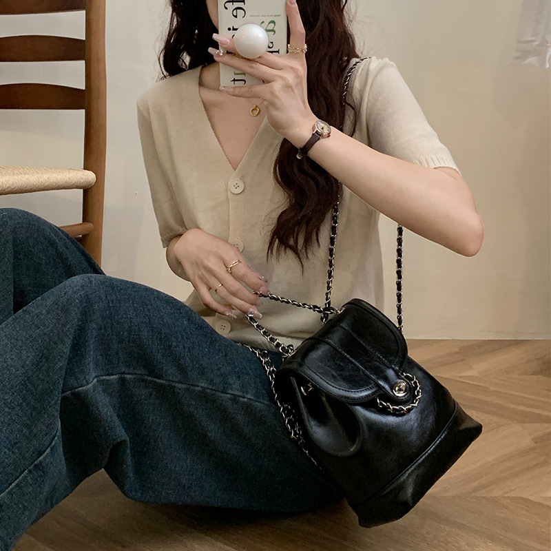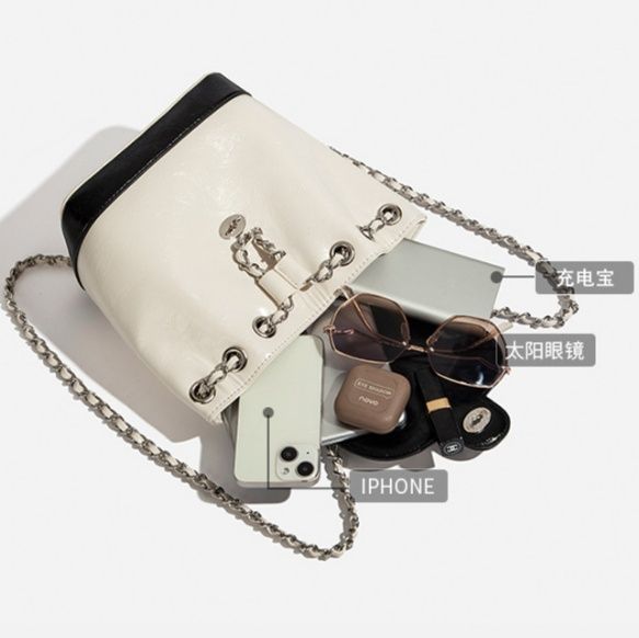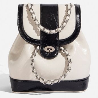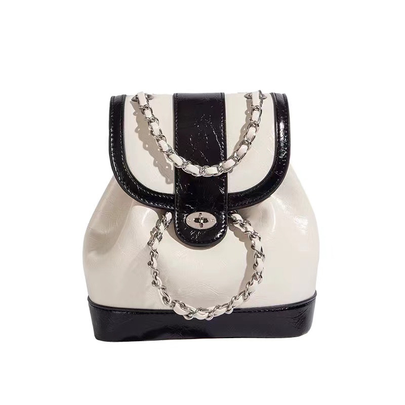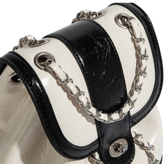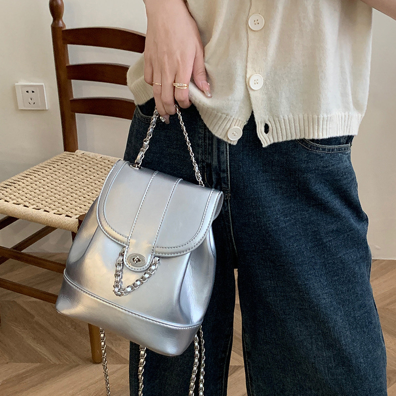 上品な光沢感のある素材とエレガントなチェーンストラップが魅力の多機能リュックです。 巾着のように開閉しやすい仕様で、荷物の出し入れもスムーズに行えます。 リュックとしてだけでなく、チェーンを使えば肩掛けバッグとしても使用できる二通りの持ち方が可能です。 フロントの装飾金具がアクセントとなり、カジュアルから上品なスタイルまで幅広い着こなしに対応します。 コンパクトながらも収納力があり、日常使いに最適な実用的なアイテムです。