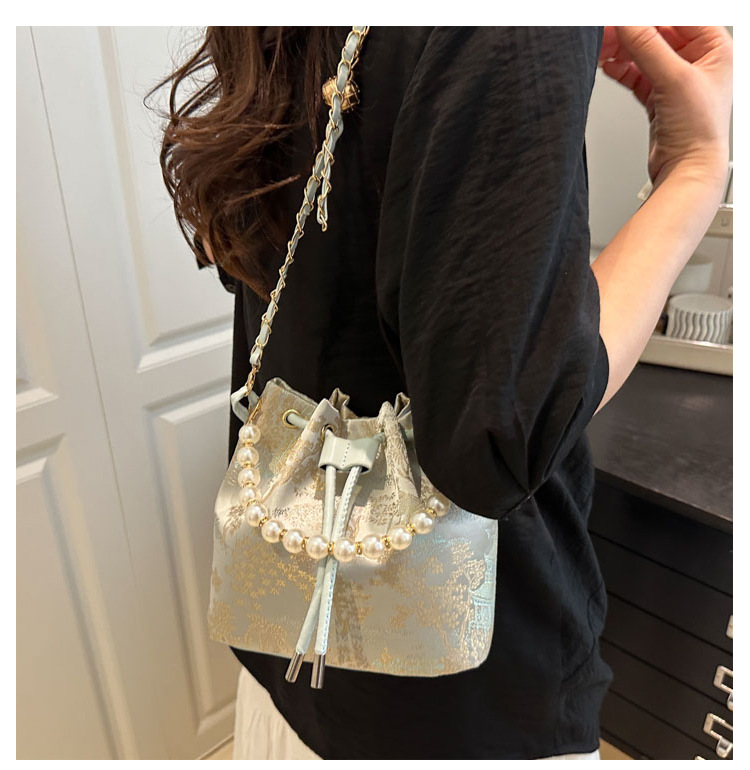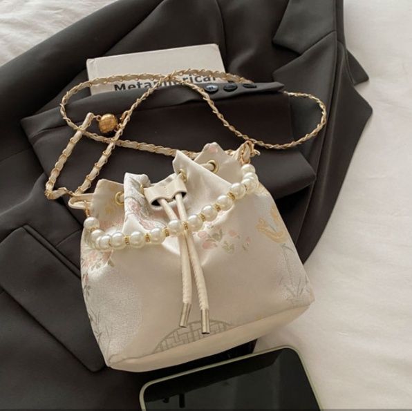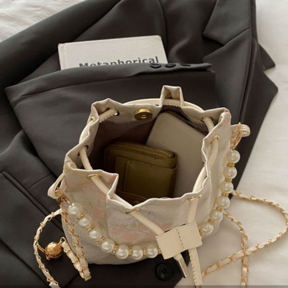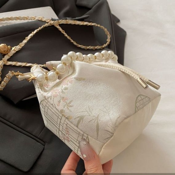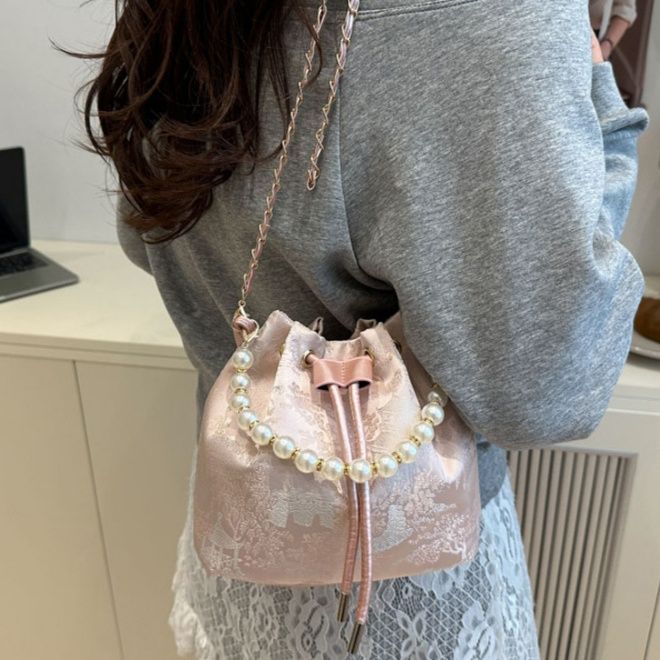 巾着特有の絞りデザインと編み込みチェーンストラップが女性らしさを演出します。