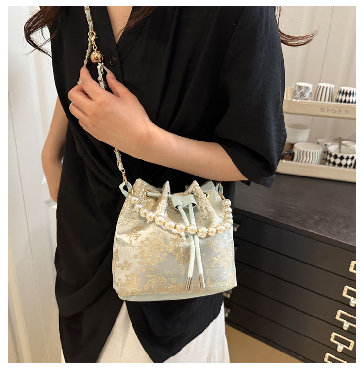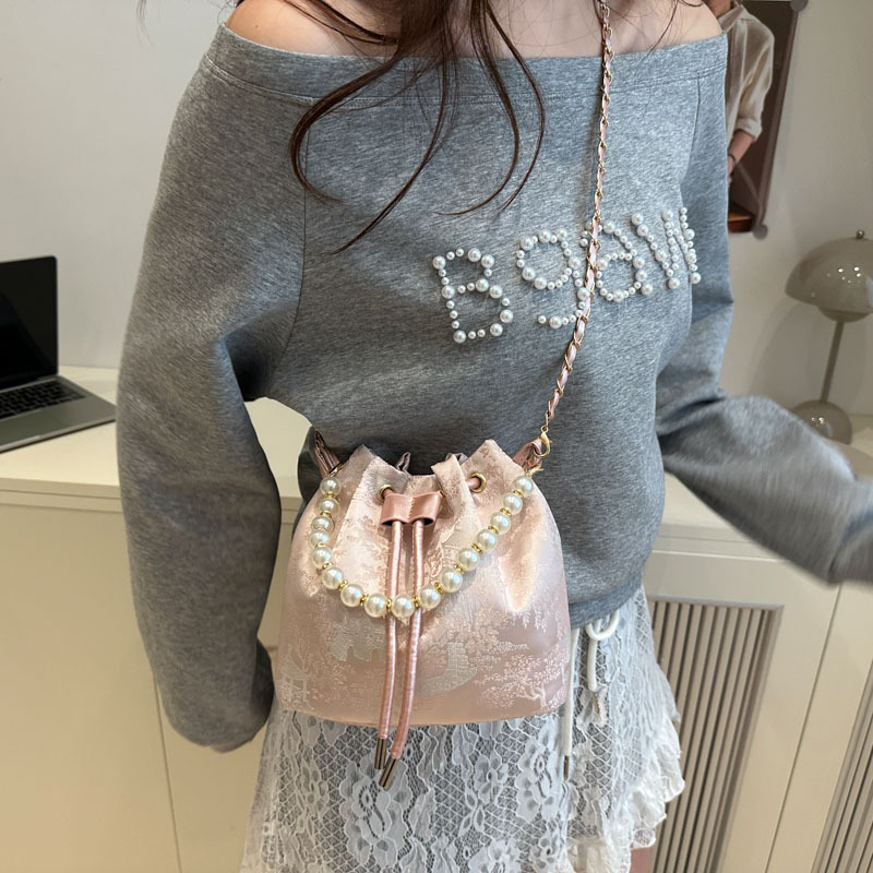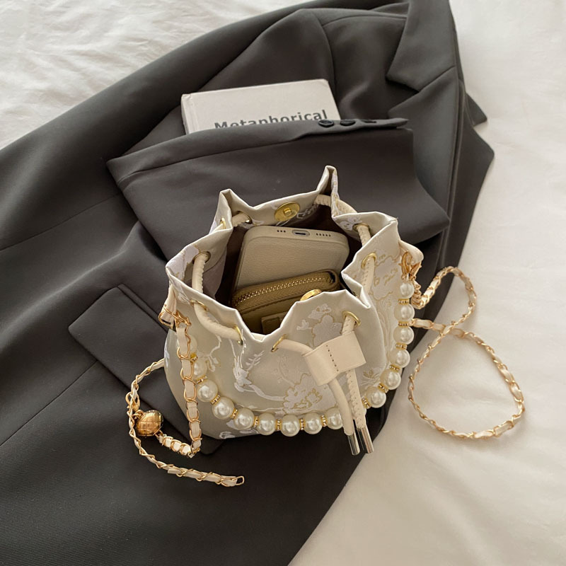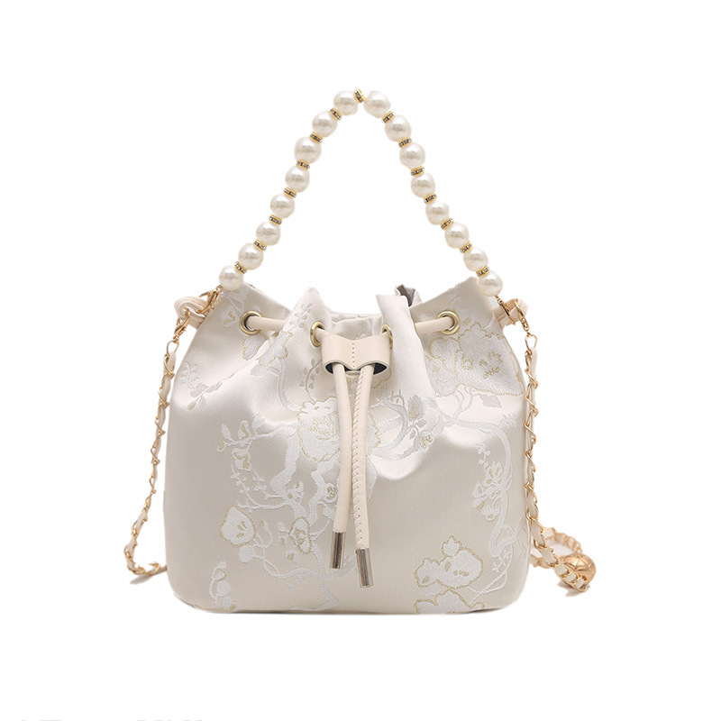 エレガントなレース刺繍が施された上品な巾着タイプのショルダーバッグです。