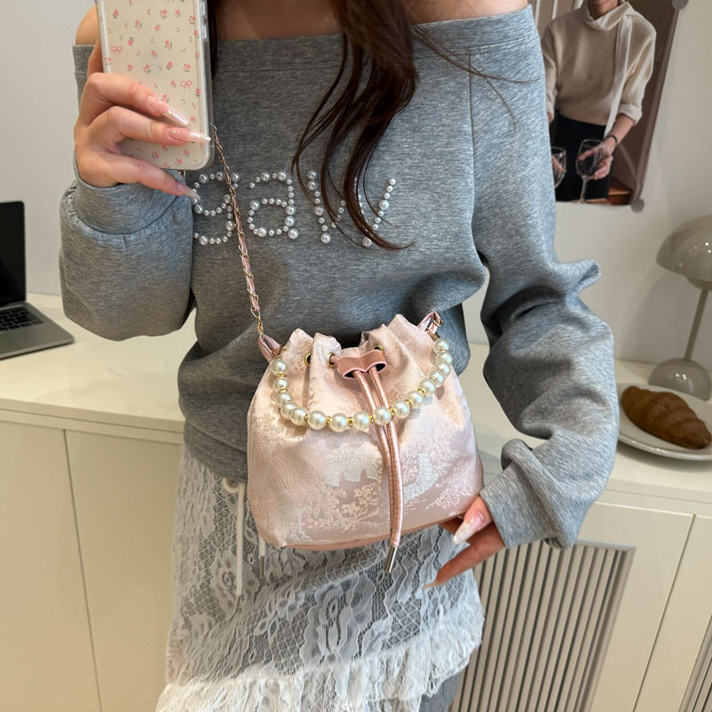 上質な素材感とパール装飾の組み合わせが、装いを格上げしてくれるショルダーバッグです。
