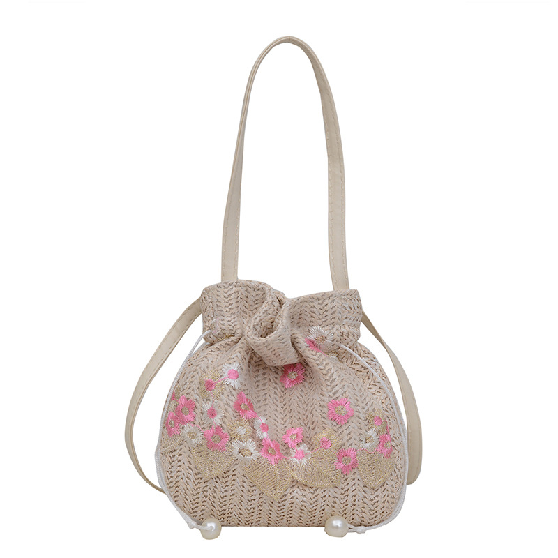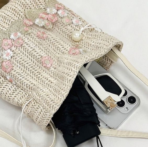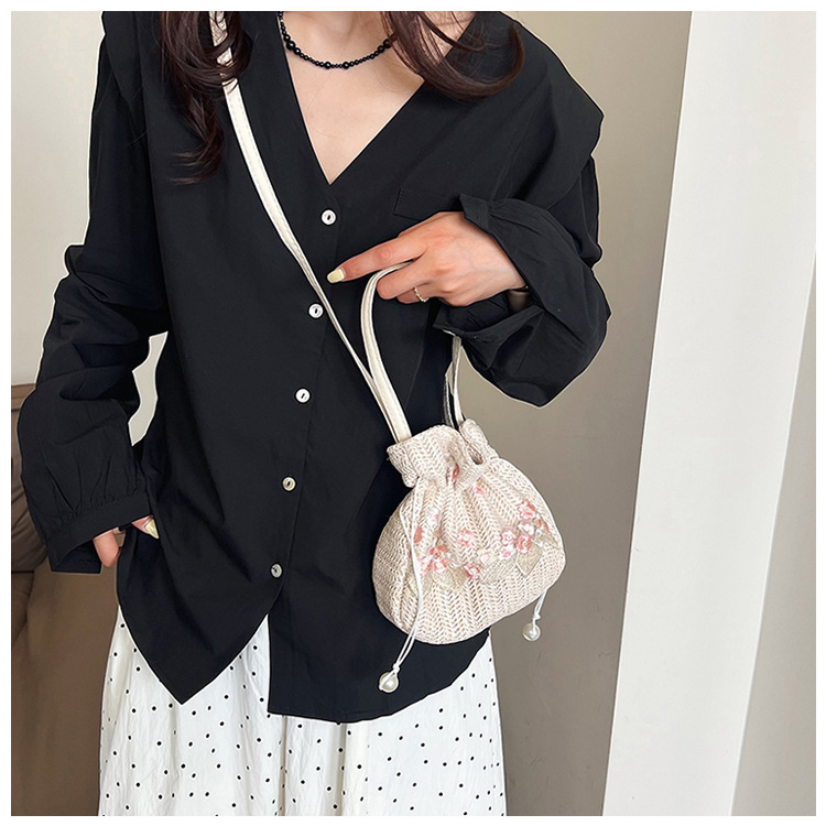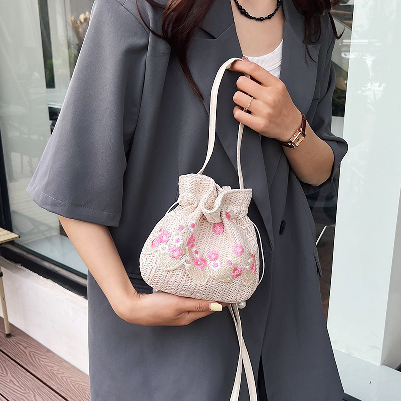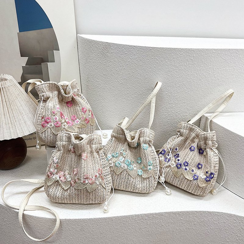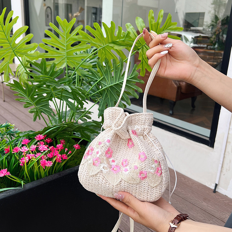 華やかな花刺繍が施された、ヘリンボーン編みが美しい巾着デザインのショルダーバッグです。