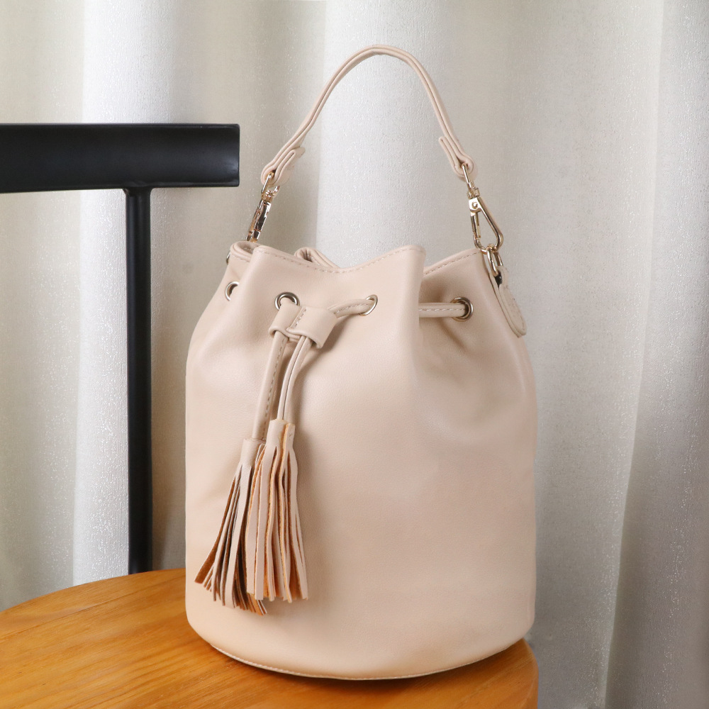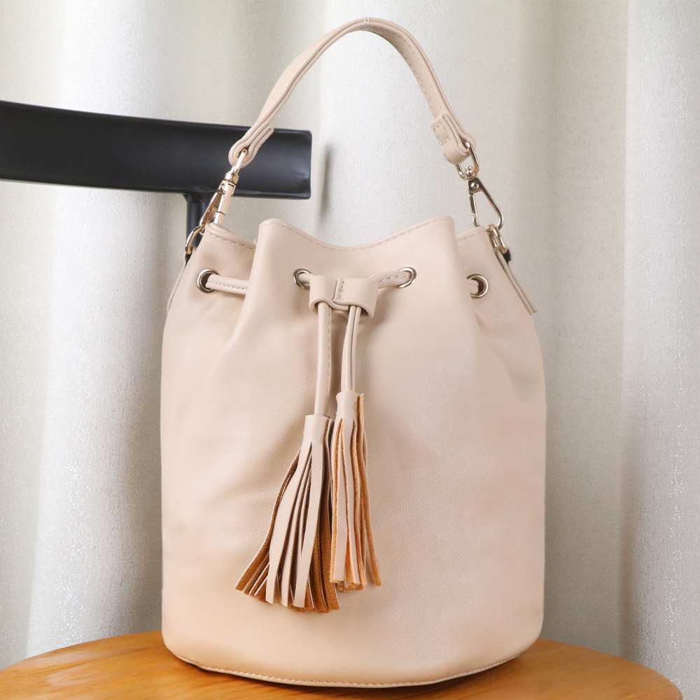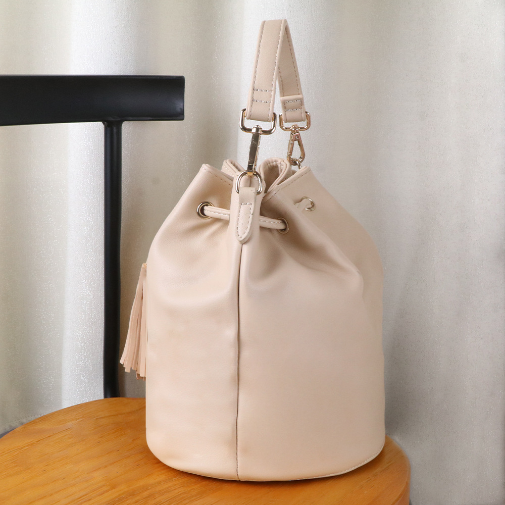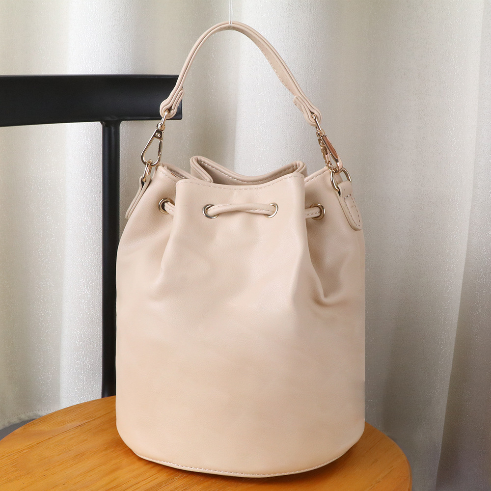 柔らかな合成皮革素材を使用した、上品な巾着デザインのショルダーバッグです。