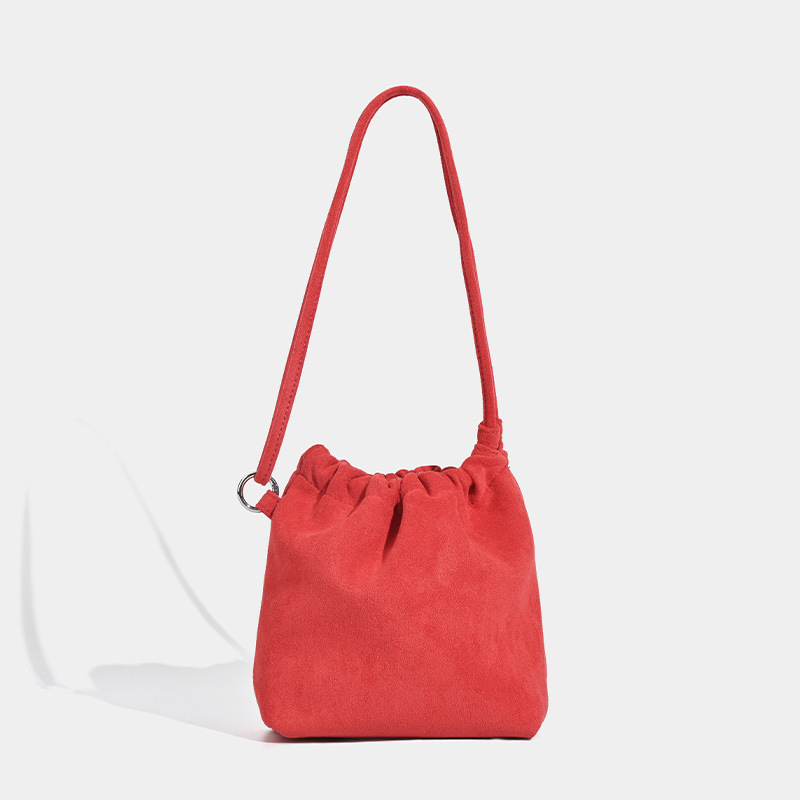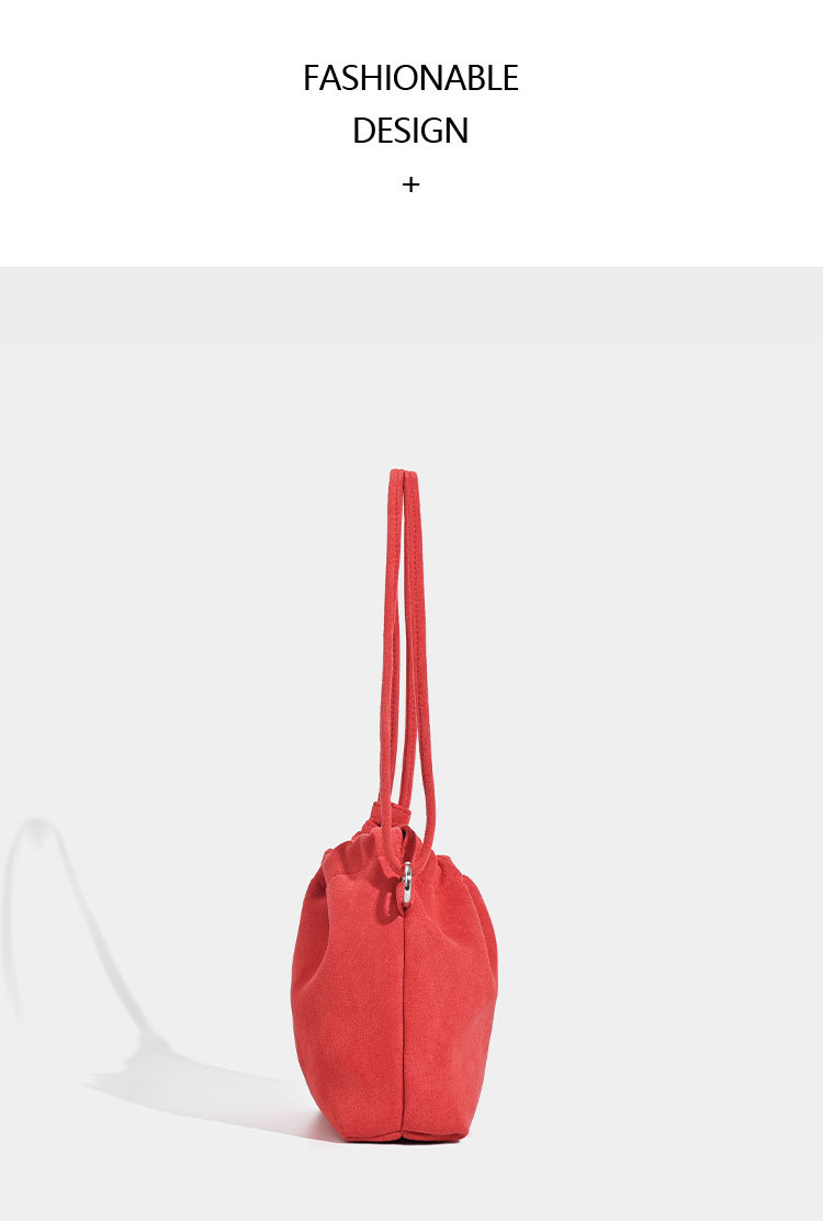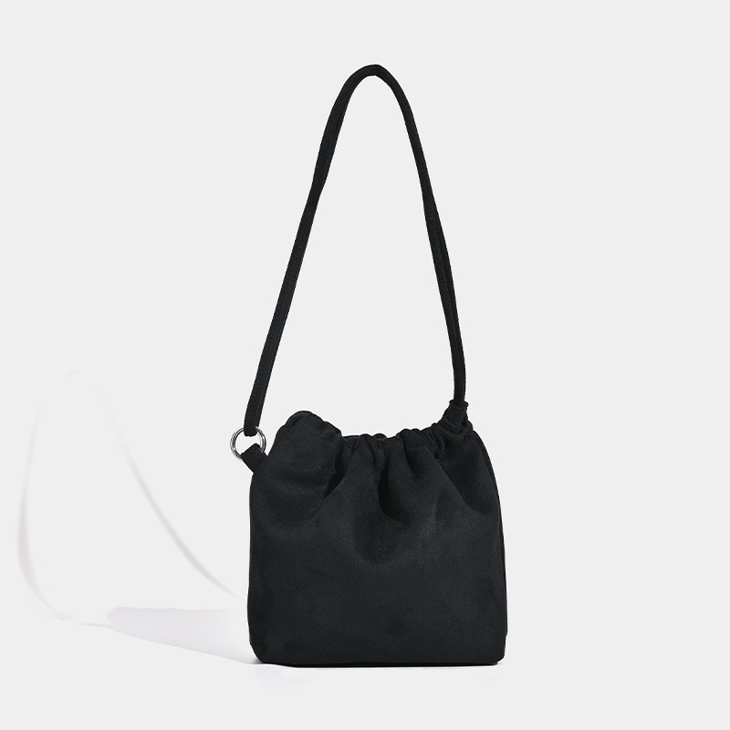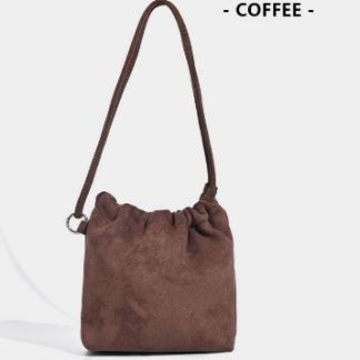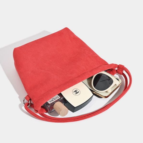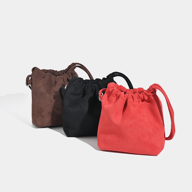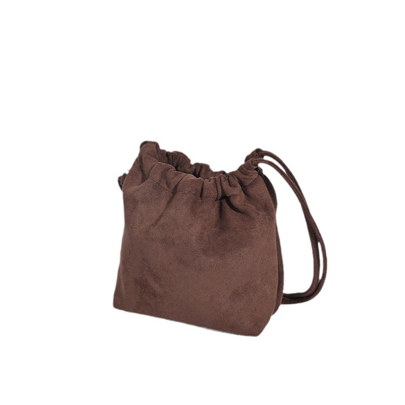 柔らかなスエード調の素材が上品な印象を与える巾着デザインのショルダーバッグです。