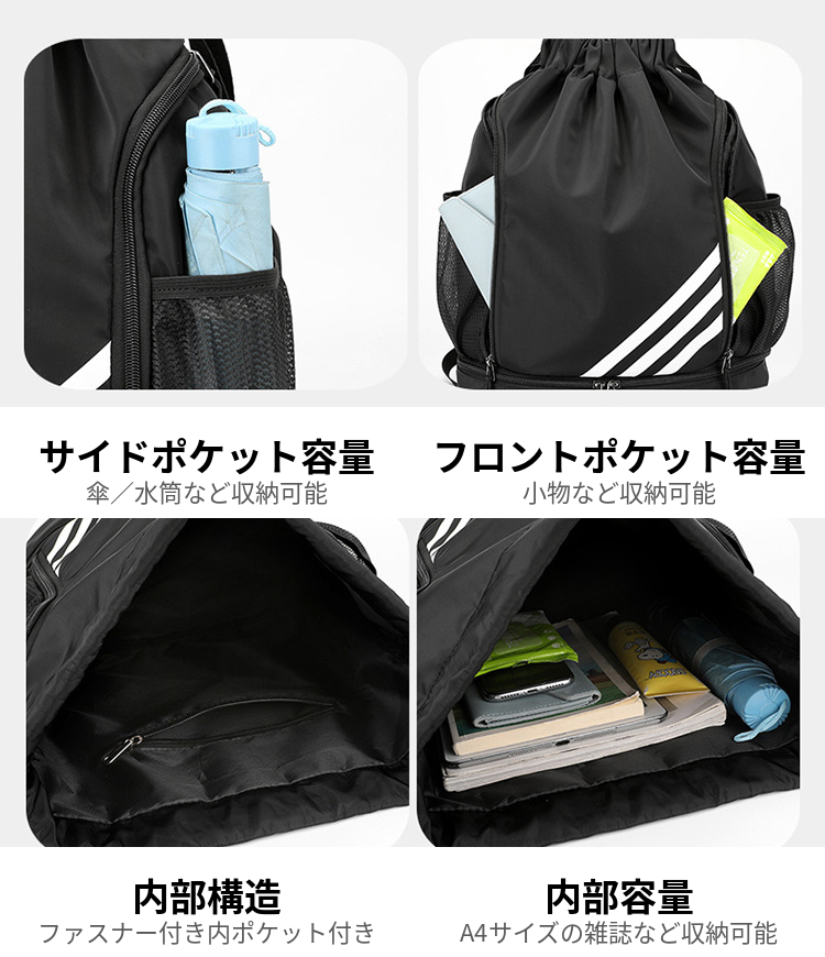 スポーティーな三本線が映える巾着タイプのリュックです。 開閉しやすい巾着仕様で、荷物の出し入れもスムーズに行えます。 両サイドにはメッシュポケットが付いており、水筒などの小物収納に便利です。 底部には独立したファスナー式収納compartmentがあり、濡れたものや靴などを分けて収納できます。 軽量で耐久性に優れた素材を使用し、通学や部活動、ジム通いなど幅広いシーンで活躍するリュックです。