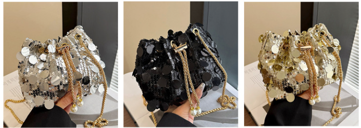 華やかなスパンコールと立体的な円形パーツを全面に施した、存在感抜群の巾着ショルダーです。 開口部は巾着仕様で荷物の出し入れもスムーズ。パール付きの紐がアクセントになっています。 上品なチェーンショルダーストラップ付きで、パーティーや特別な日のお出かけに最適です。 きらめく装飾が視線を集める、個性的でエレガントな一品となっています。