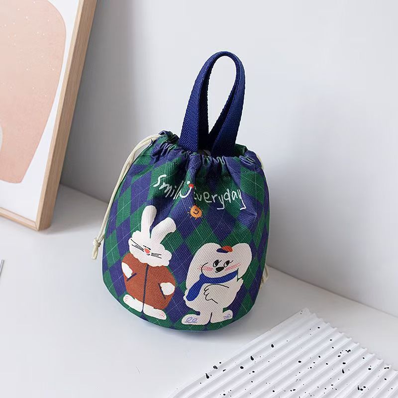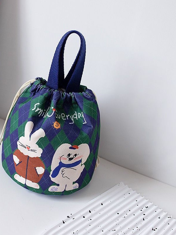 可愛らしいうさぎと雪だるまの刺繍が施された、チェック柄の巾着ポーチです。