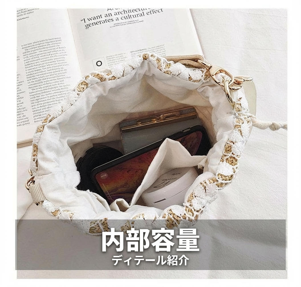 花柄のレース生地が全体を華やかに彩り、ナチュラルな編み込み素材との組み合わせが魅力的なデザインとなっています。