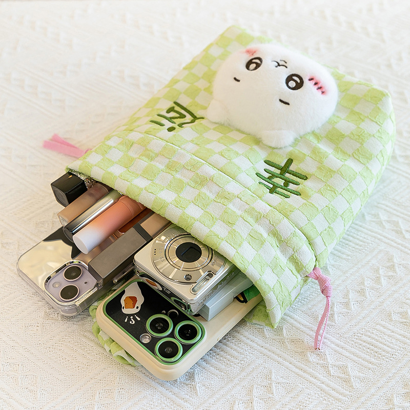 紐を引くだけで簡単に開閉でき、小物の収納や持ち運びに便利です。