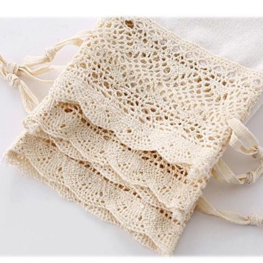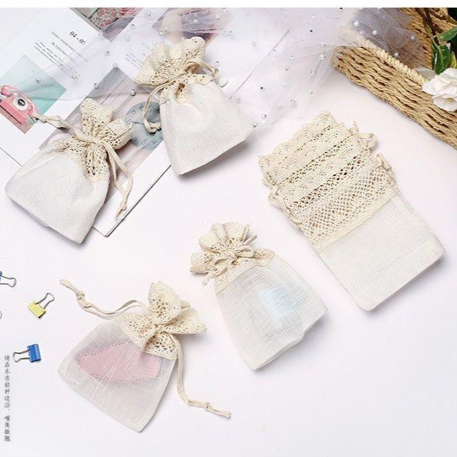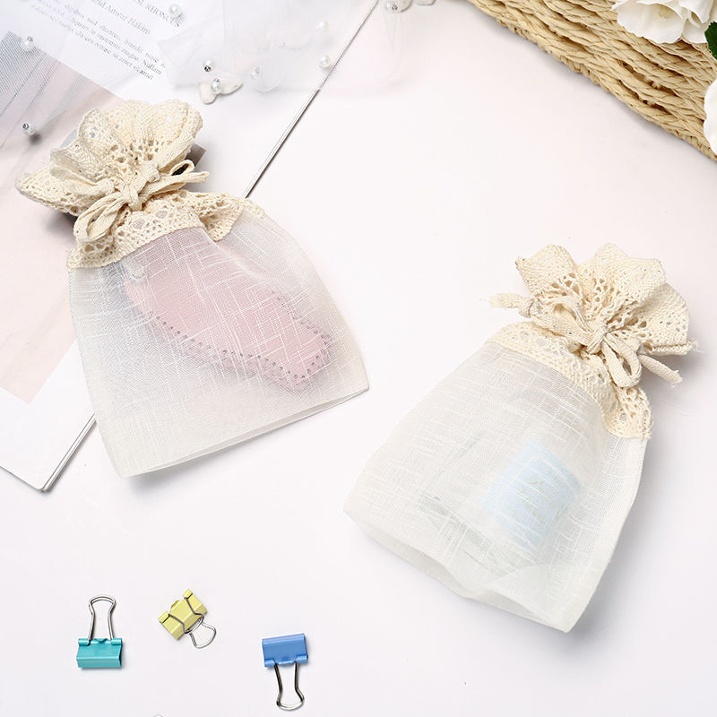 繊細なレース飾りが愛らしい、透け感のある生地を使用した巾着タイプのポーチです。
