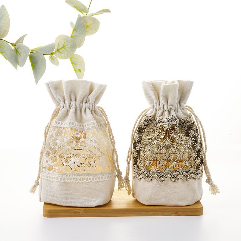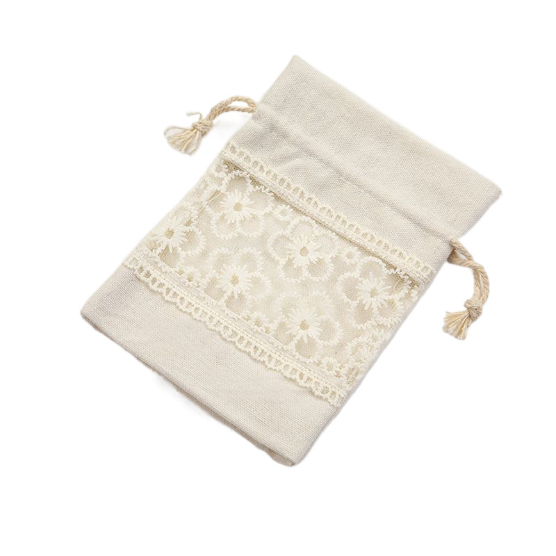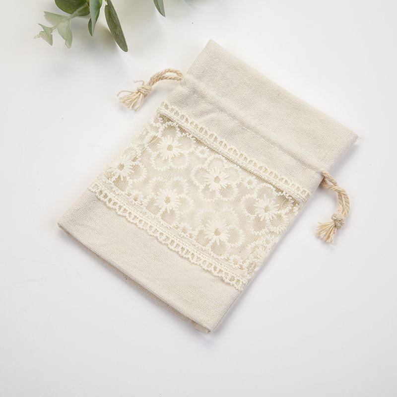 優しい風合いのリネン調生地に繊細な花刺繍レースをあしらった上品な巾着ポーチです。 中央に配された花柄の刺繍レースが可憐で、ナチュラルな雰囲気を演出します。 紐で開閉できる使いやすい巾着タイプで、化粧品や小物の収納に最適です。 ギフトラッピングとしても喜ばれる、温かみのある手作り感が魅力のポーチです。 普段使いはもちろん、贈り物の袋としても活躍します。