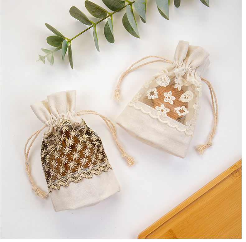 優しい風合いのリネン調生地に繊細な花刺繍レースをあしらった上品な巾着ポーチです。
