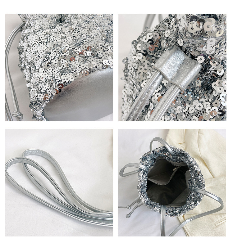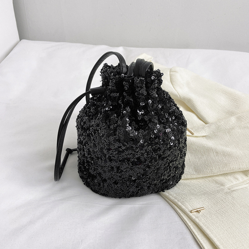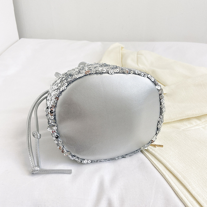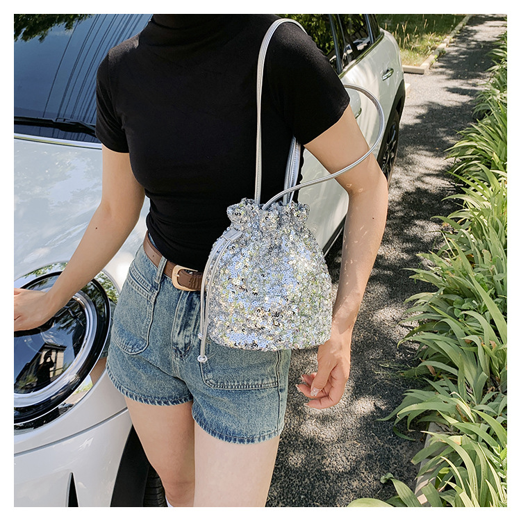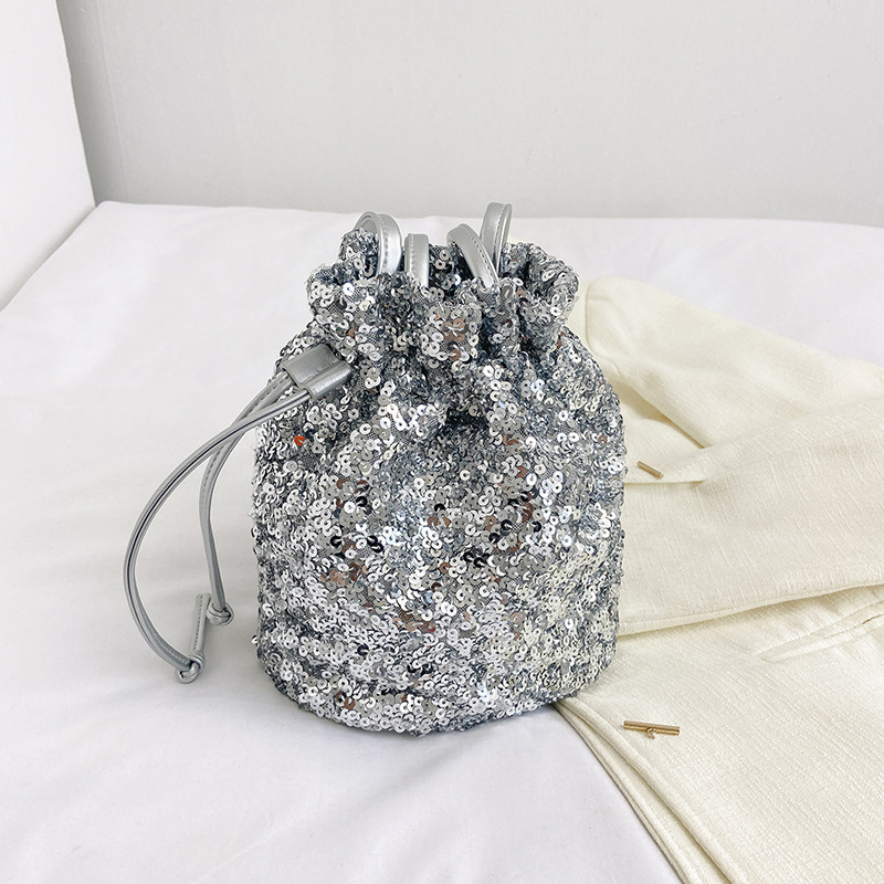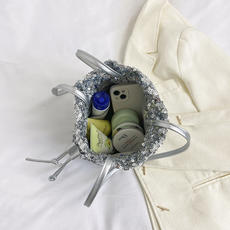 全面に散りばめられたスパンコールが華やかに輝く巾着タイプのトートバッグです。