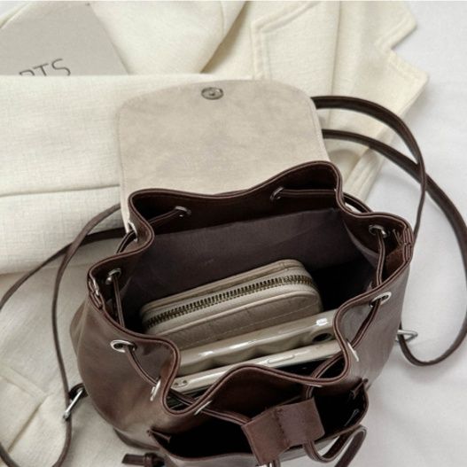 フラップ付きで中身をしっかり守りながら、巾着の紐で開閉も簡単に調節できます。