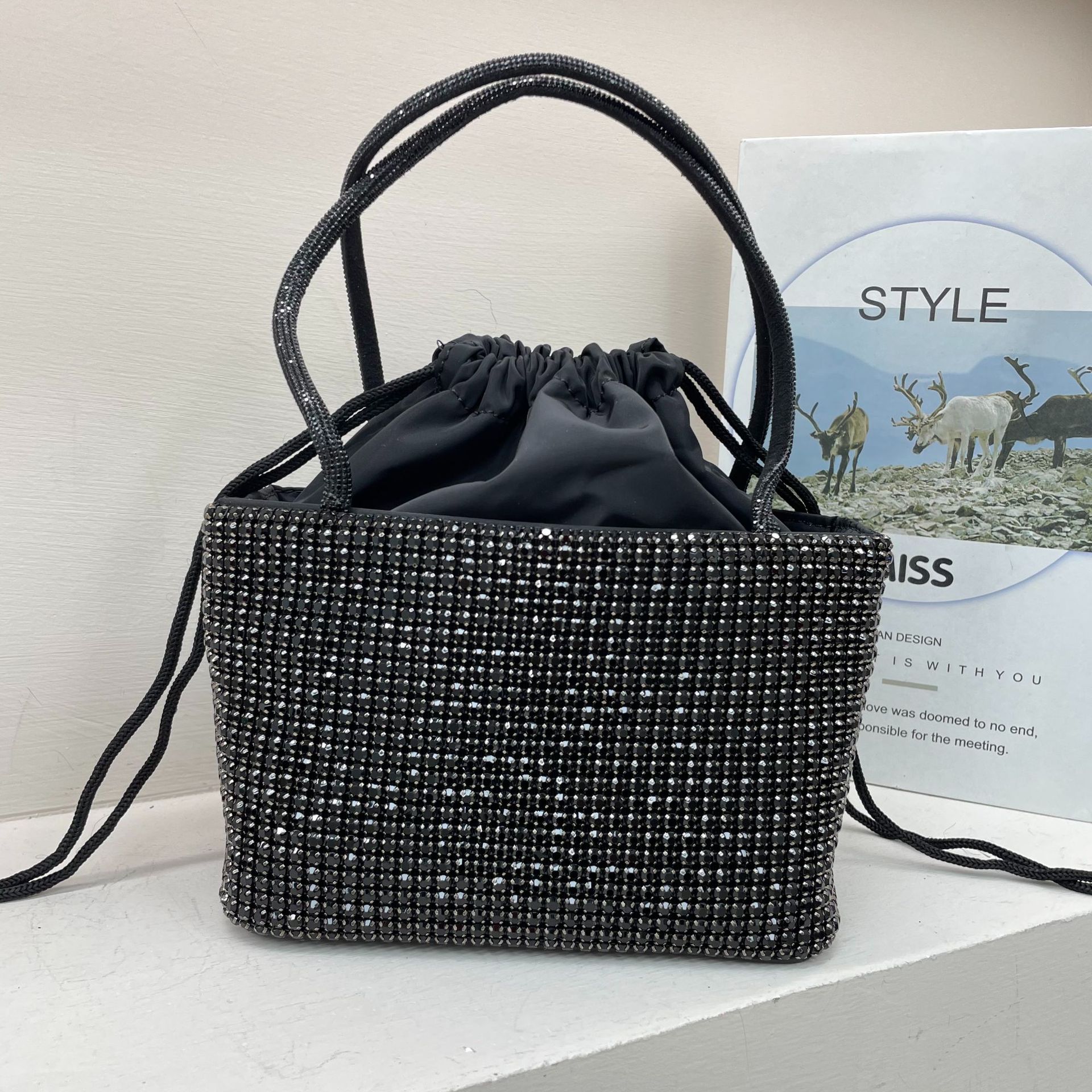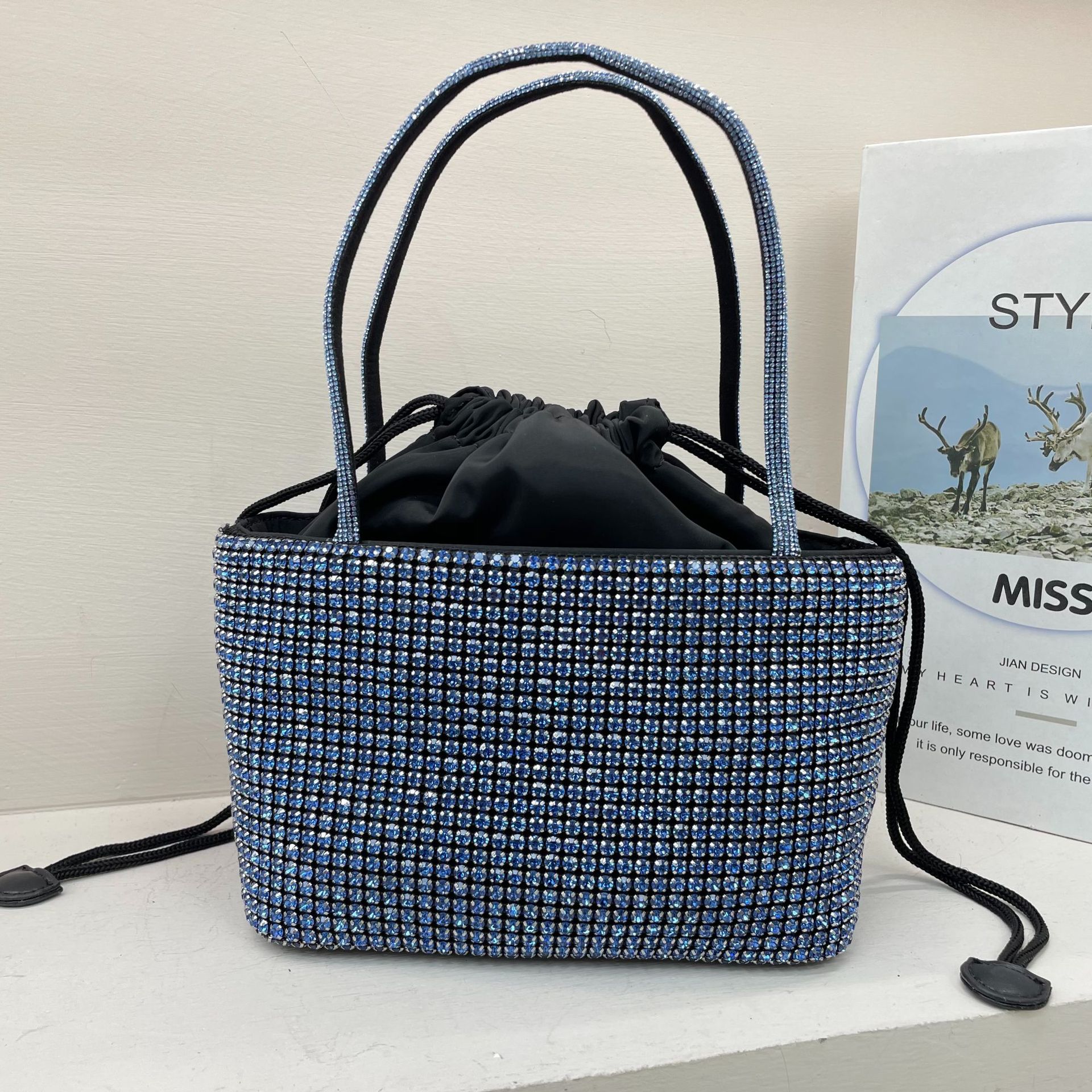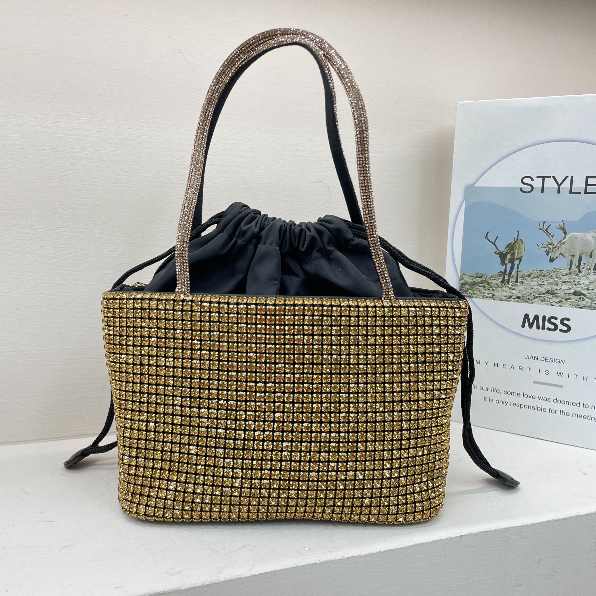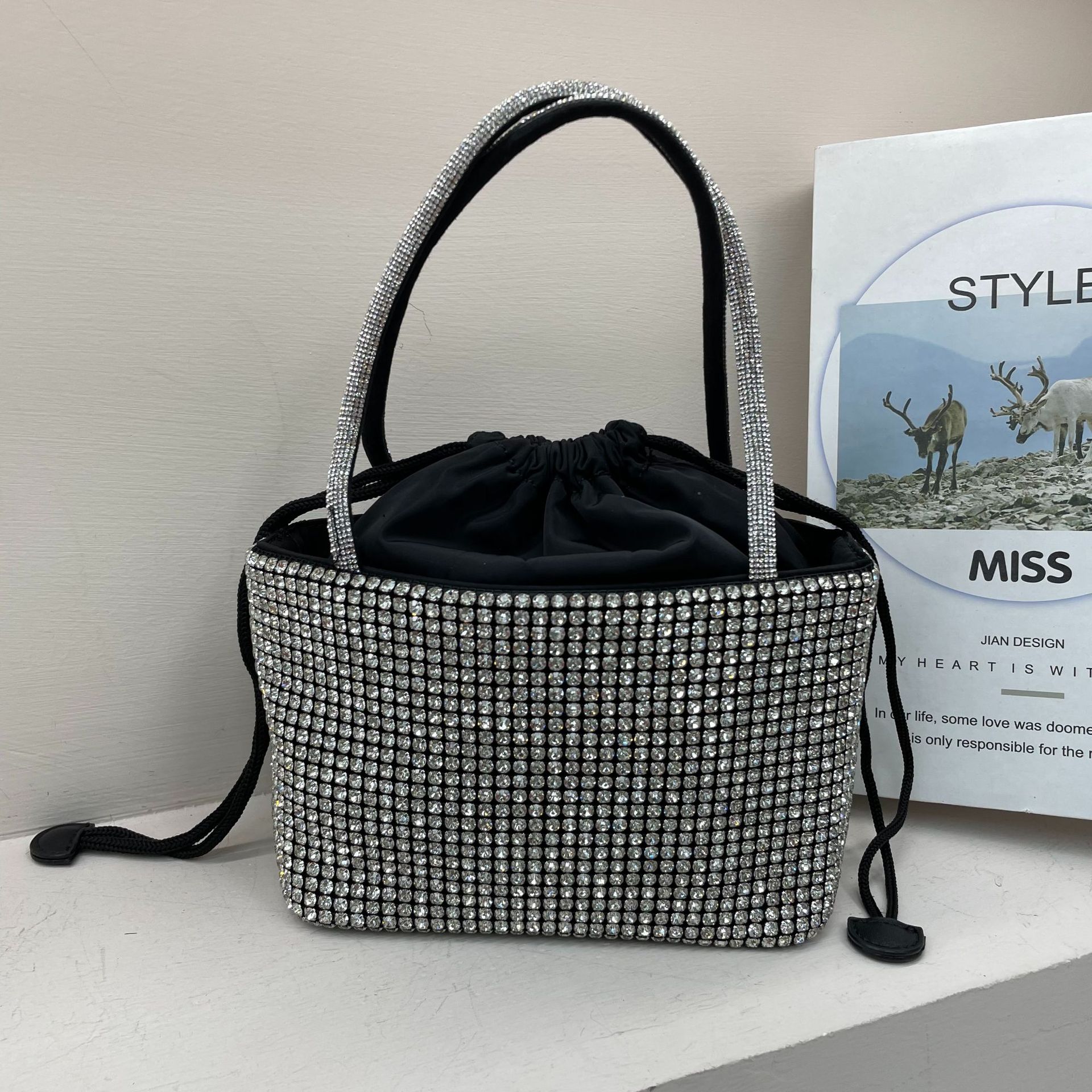 全面に散りばめられたラインストーンが華やかに輝く巾着タイプのトートバッグです。 開口部は巾着仕様で中身をしっかり守りながら、出し入れもスムーズに行えます。 コンパクトなサイズ感ながら必需品はしっかり収納でき、パーティーシーンや特別な日のお出かけに最適です。 取り外し可能なチェーンストラップ付きで、手提げと斜め掛けの二通りの持ち方が楽しめます。 華やかな装飾が施されたトートは、装いを一層引き立ててくれる存在感抜群のアイテムです。