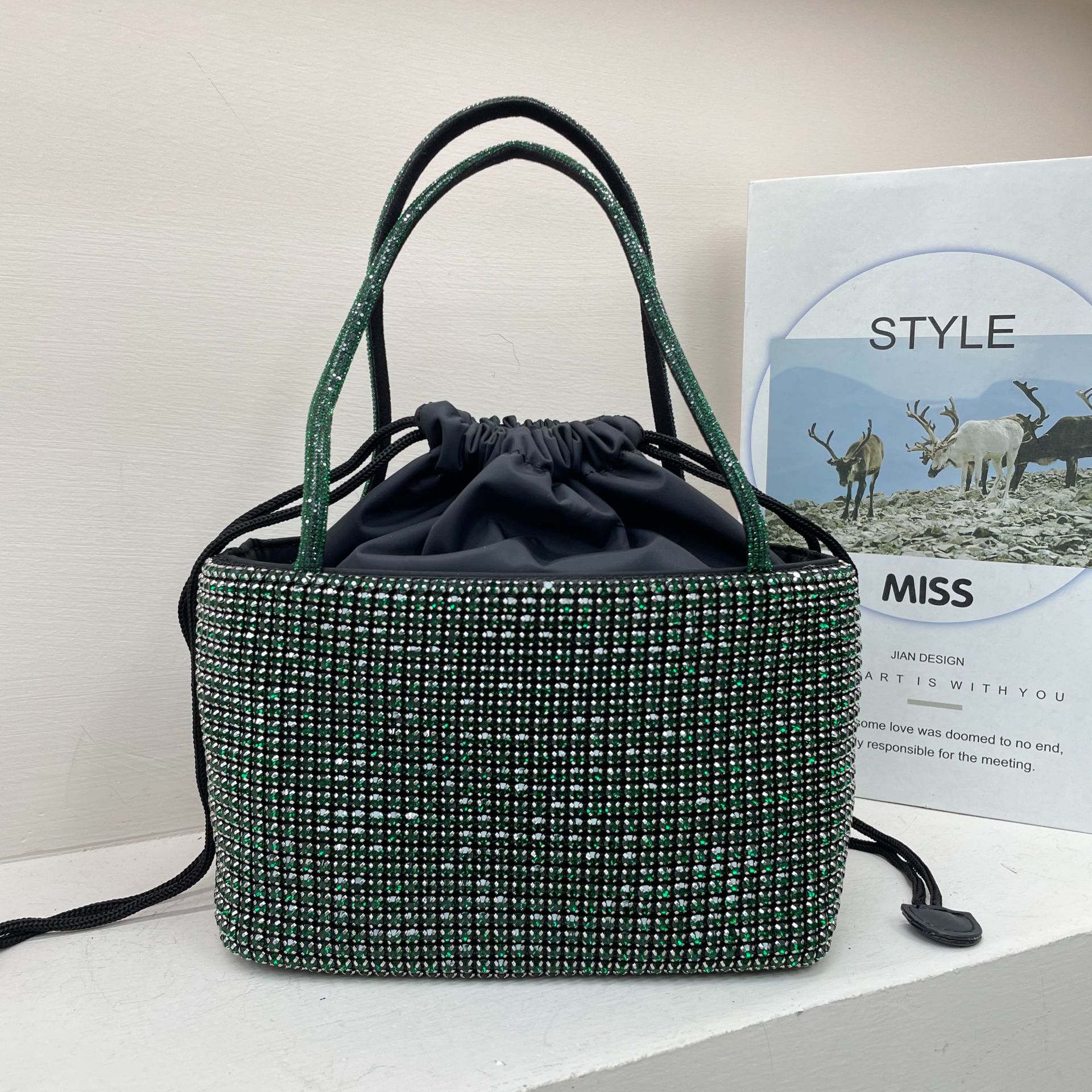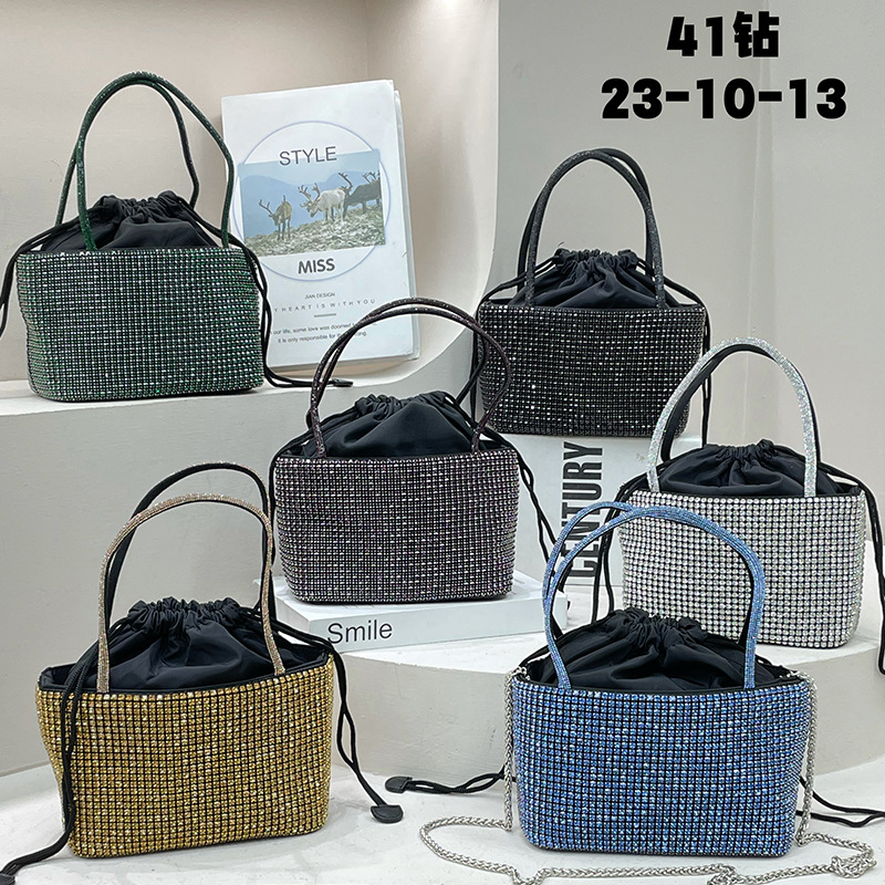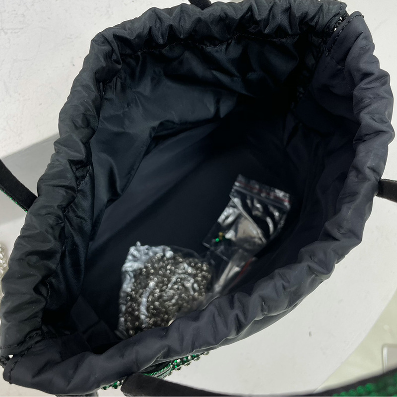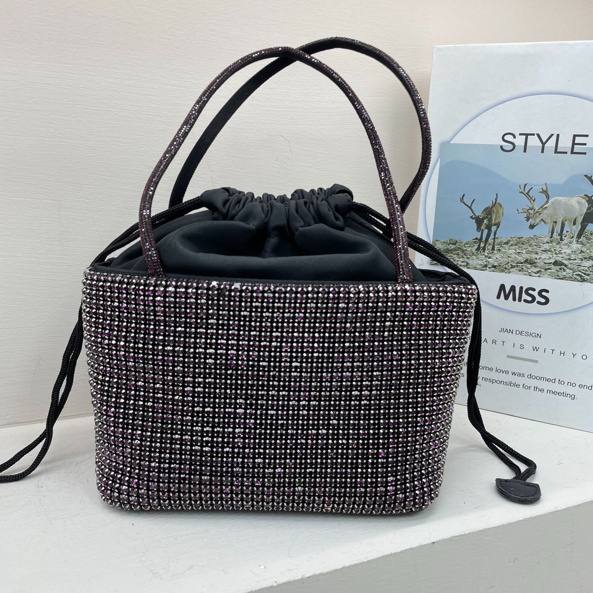 全面に散りばめられたラインストーンが華やかに輝く巾着タイプのトートバッグです。 開口部は巾着仕様で中身をしっかり守りながら、出し入れもスムーズに行えます。 コンパクトなサイズ感ながら必需品はしっかり収納でき、パーティーシーンや特別な日のお出かけに最適です。 取り外し可能なチェーンストラップ付きで、手提げと斜め掛けの二通りの持ち方が楽しめます。 華やかな装飾が施されたトートは、装いを一層引き立ててくれる存在感抜群のアイテムです。
