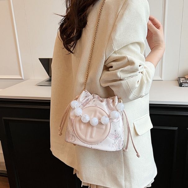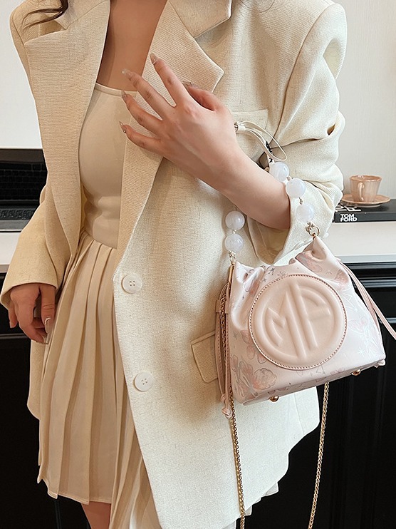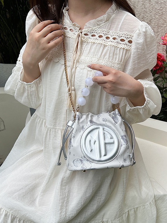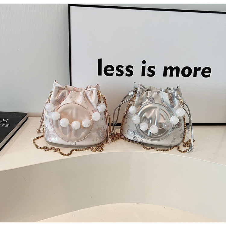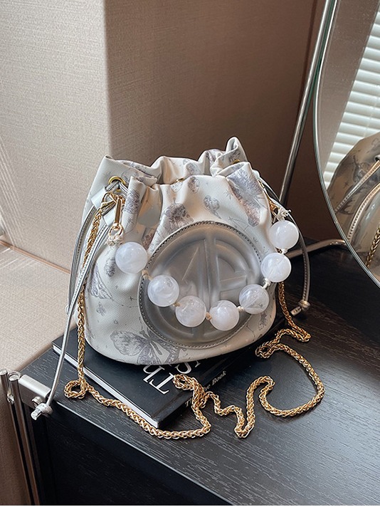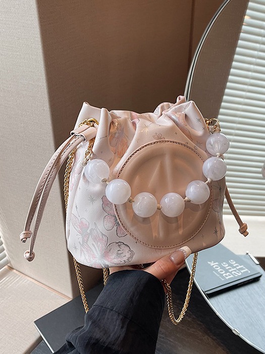 透明素材と丸いパールビーズが可愛らしい巾着タイプのショルダーバッグです。