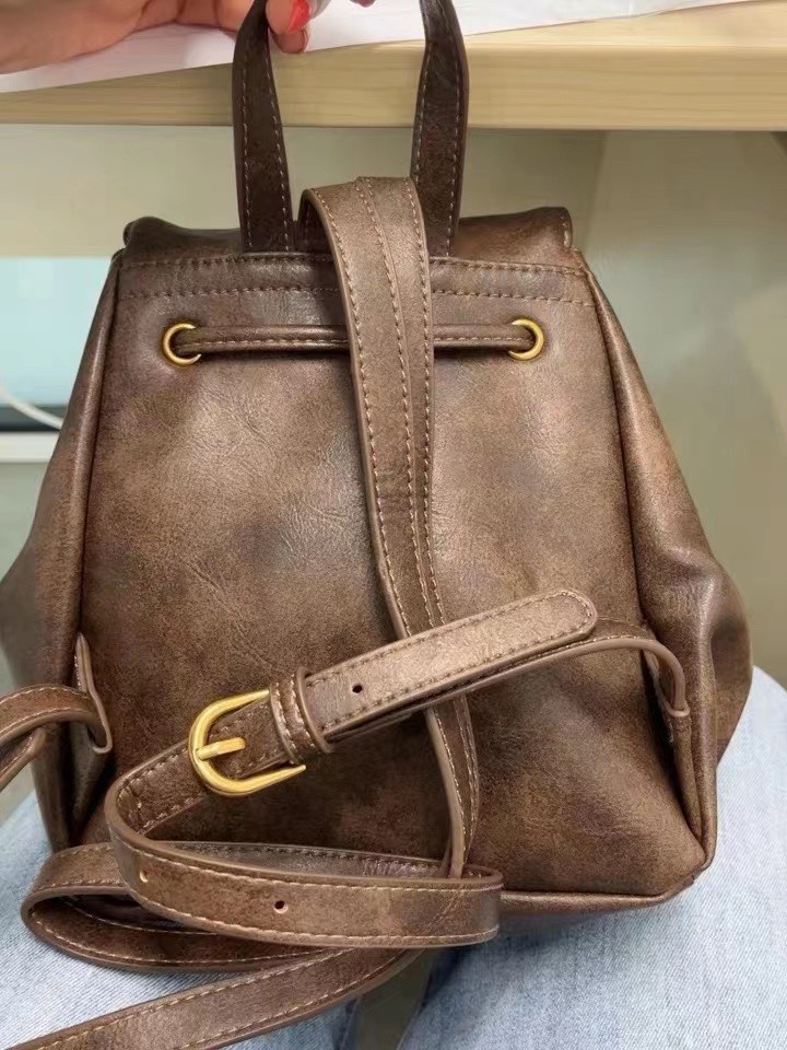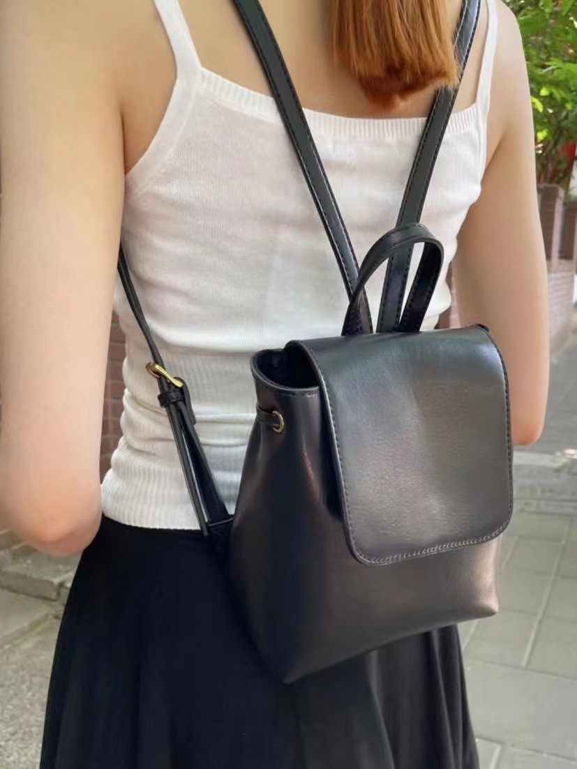 柔らかな合成皮革を使用した上品な印象の巾着リュックです。 フラップ式のかぶせ蓋がアクセントになり、大人カジュアルなスタイルを演出します。 巾着部分は開閉しやすく、内側の荷物をしっかり守ります。 リュックとしても肩掛けとしても使える二通りの持ち方が可能で、日常使いから通勤通学まで幅広く活躍します。 コンパクトながら収納力もあり、必要な荷物をすっきり整理できる実用的なデザインです。