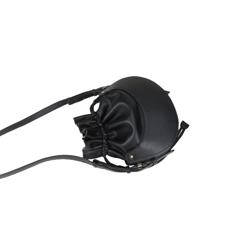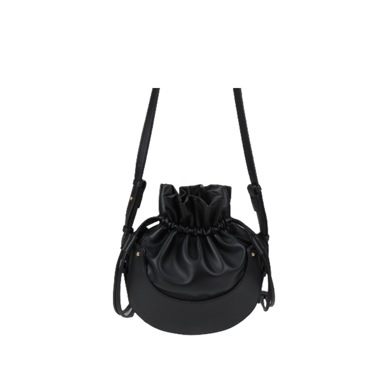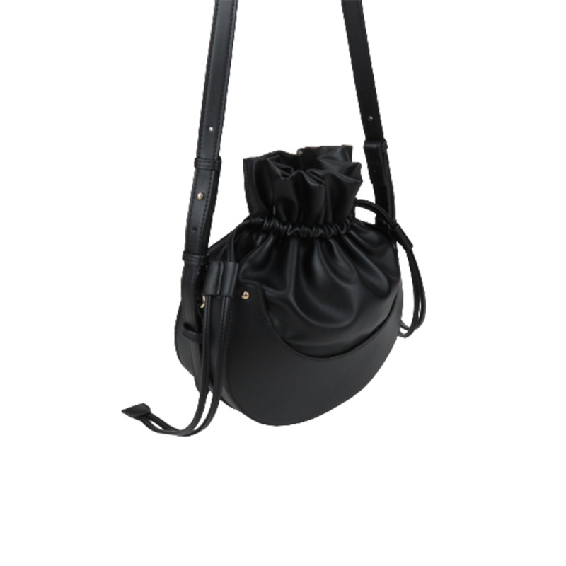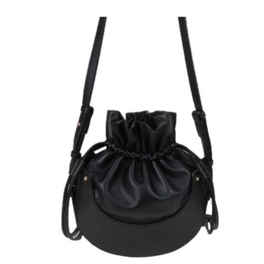 丸みを帯びた底部分が特徴的な巾着タイプのショルダーバッグです。 柔らかな合成皮革素材を使用し、開口部は紐で絞るデザインになっています。 調節可能なショルダーストラップ付きで、斜め掛けや肩掛けなど好みのスタイルでお使いいただけます。 コンパクトながらも必需品はしっかり収納でき、カジュアルからきれいめスタイルまで幅広いコーディネートに対応します。 軽量で持ち運びやすく、日常使いに最適な一品です。