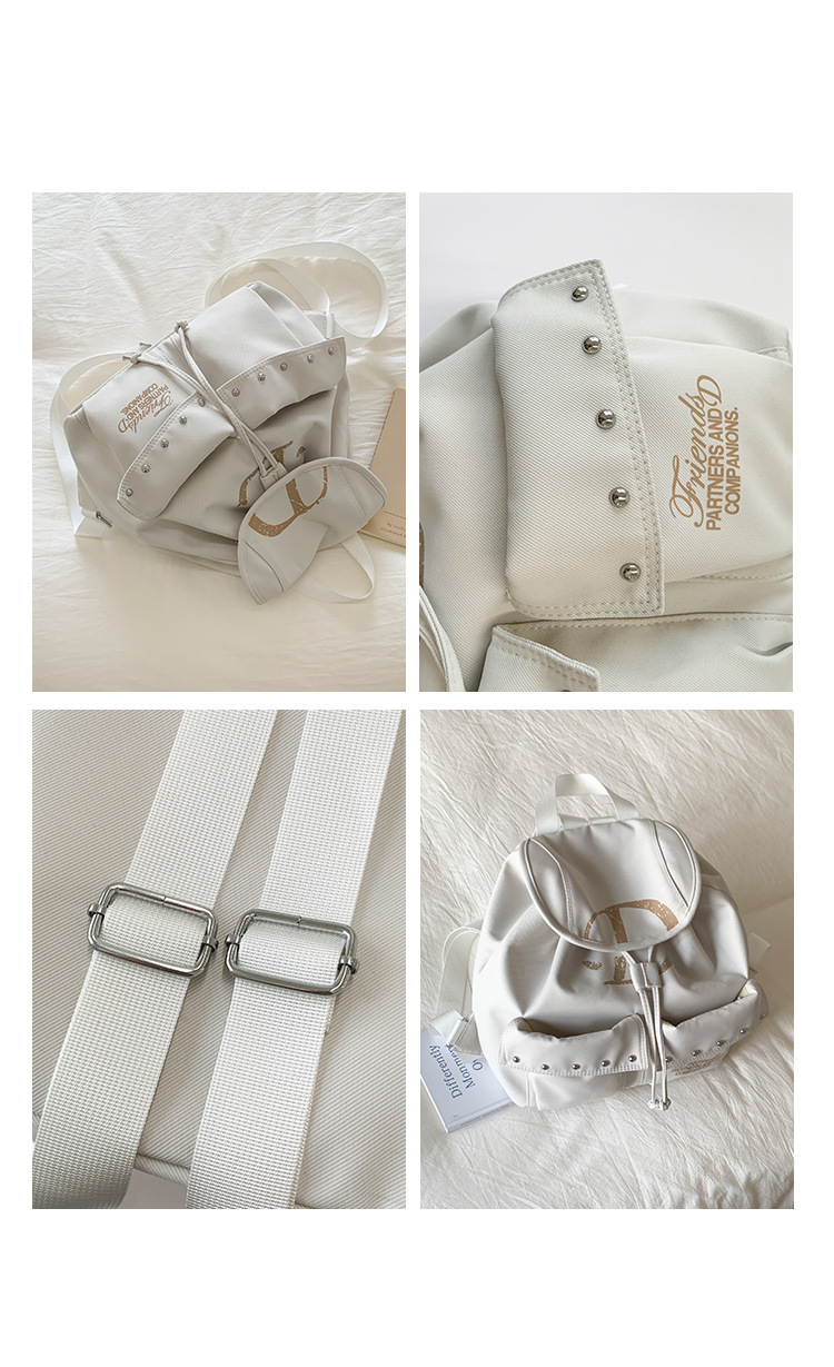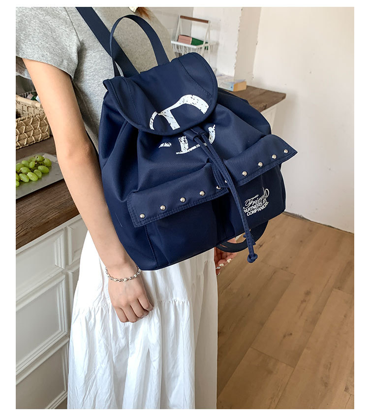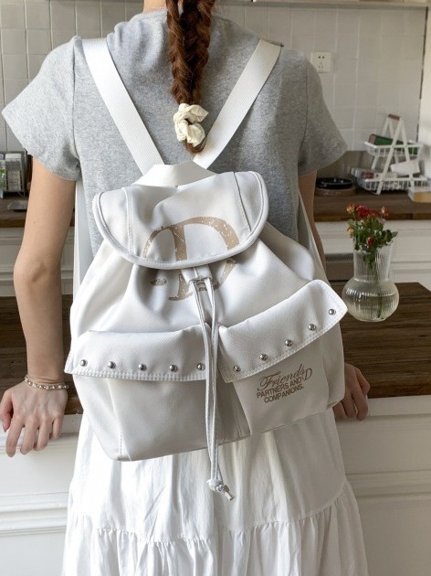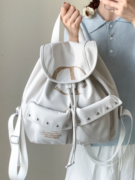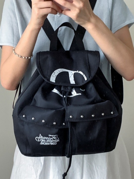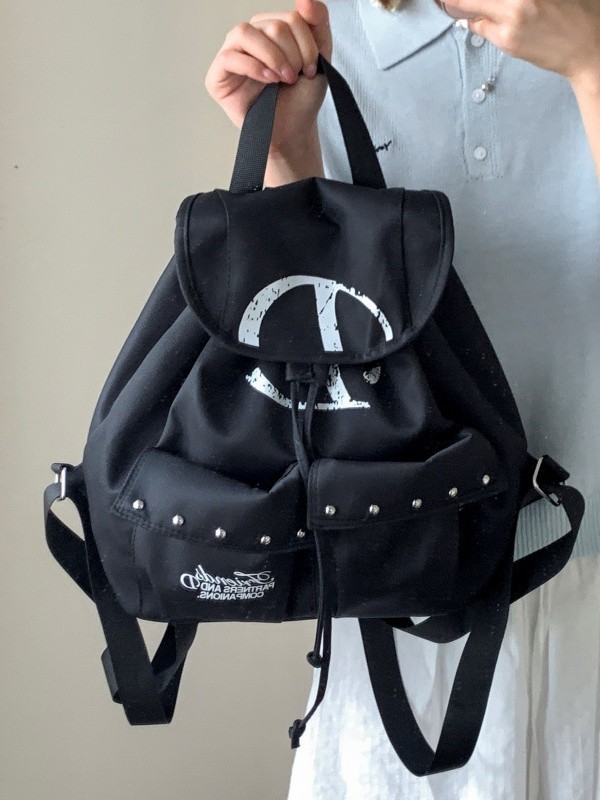 前面には便利な大きめポケットが二つ配置され、スタッズ装飾がアクセントになっています。