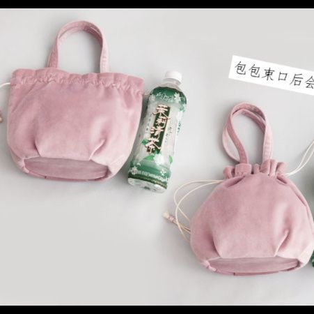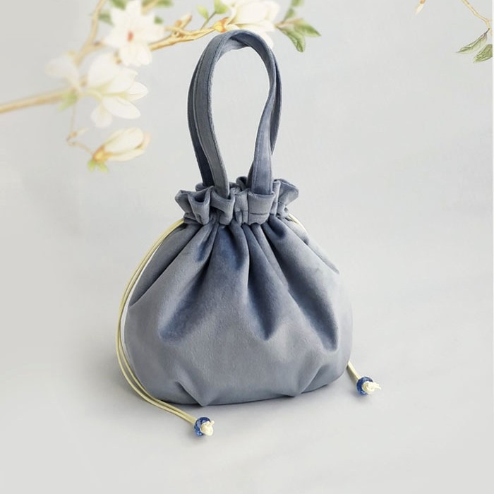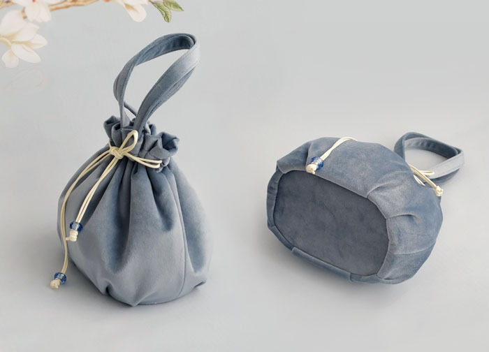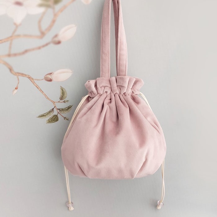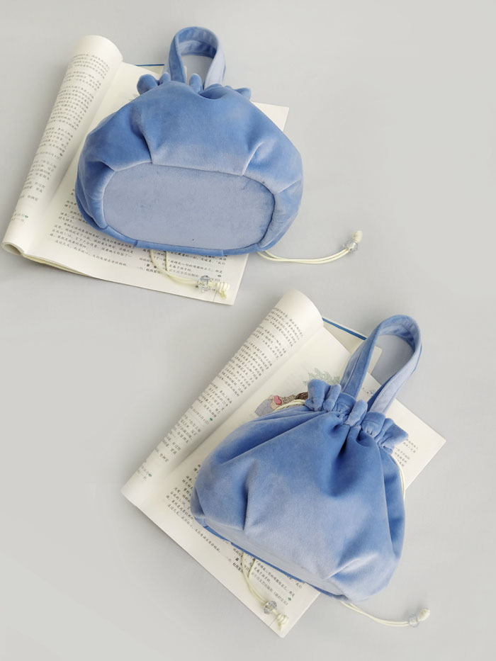 柔らかな素材が優しい印象を与える巾着型のポーチです。
