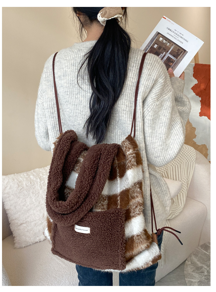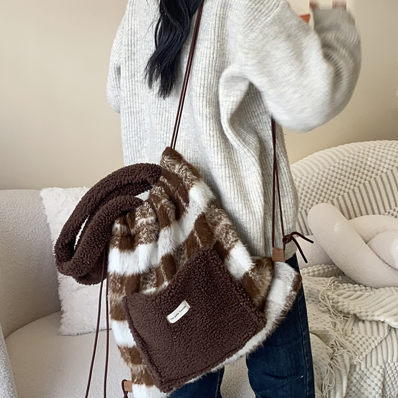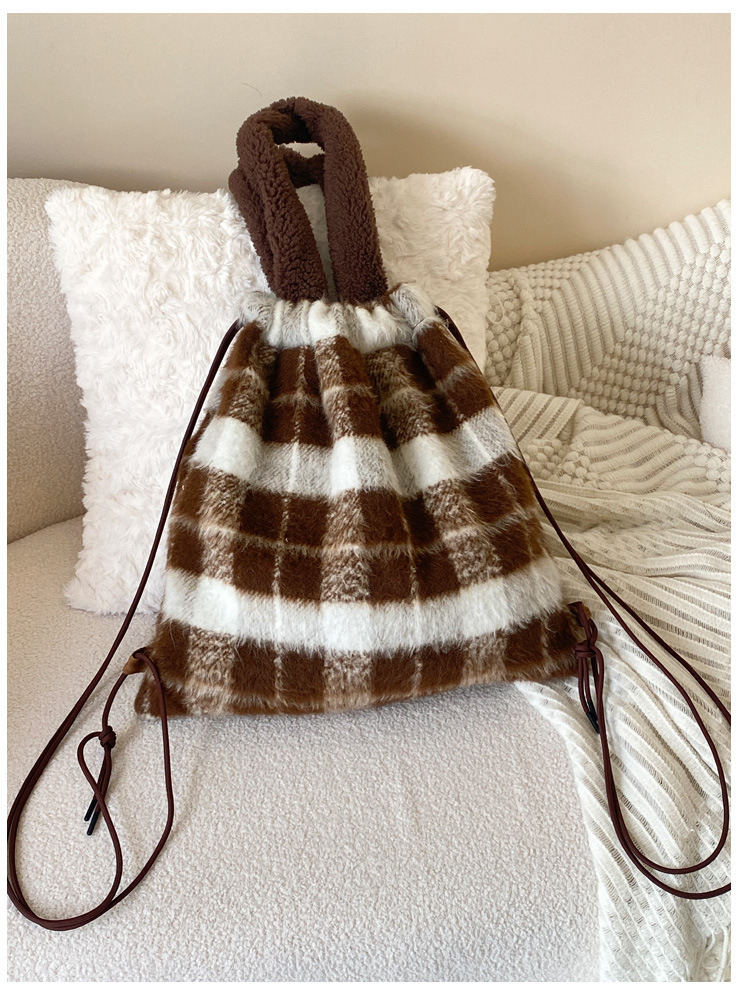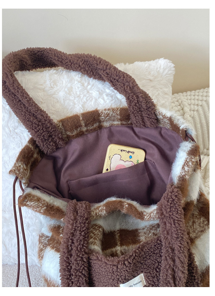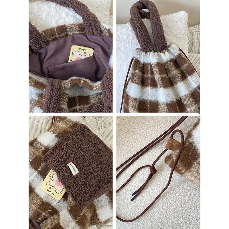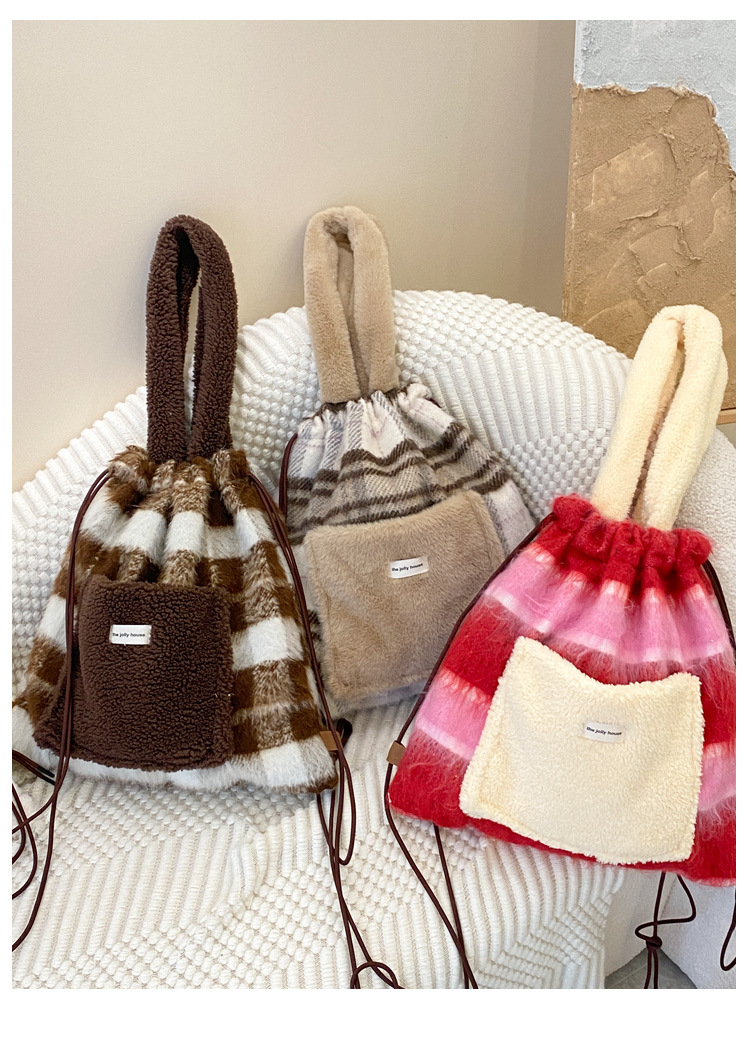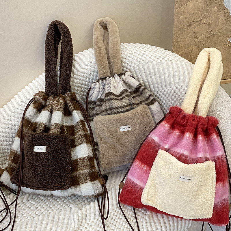 ふわふわのボア素材とフリース生地を組み合わせた温かみのある巾着ポーチです。