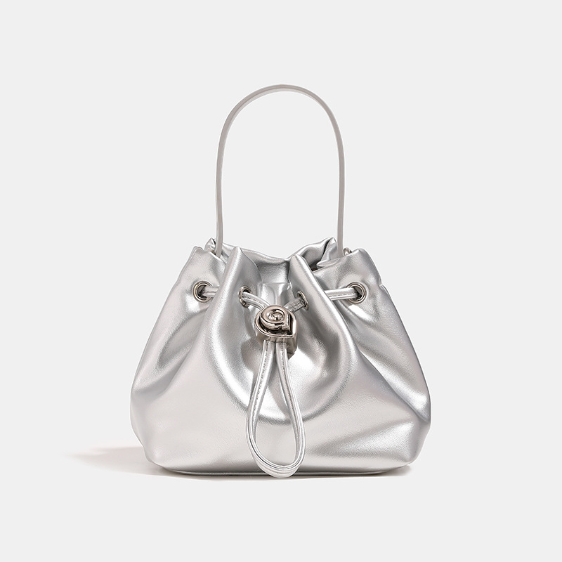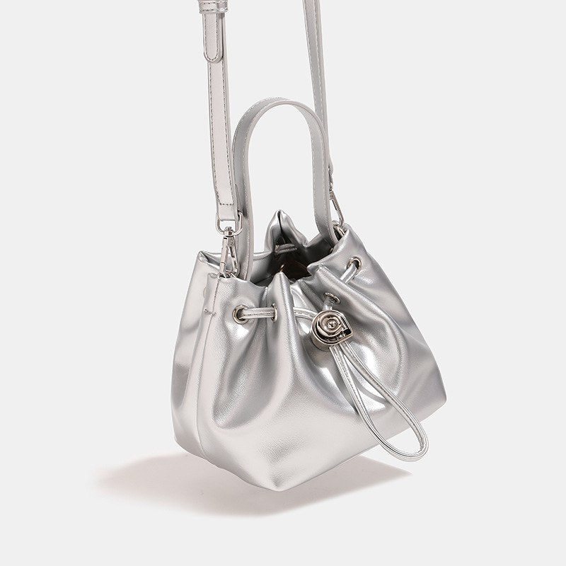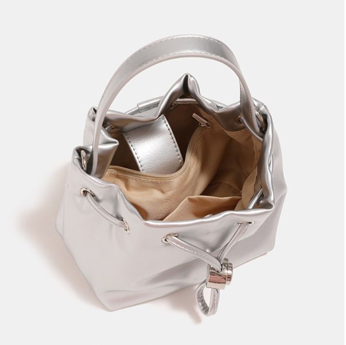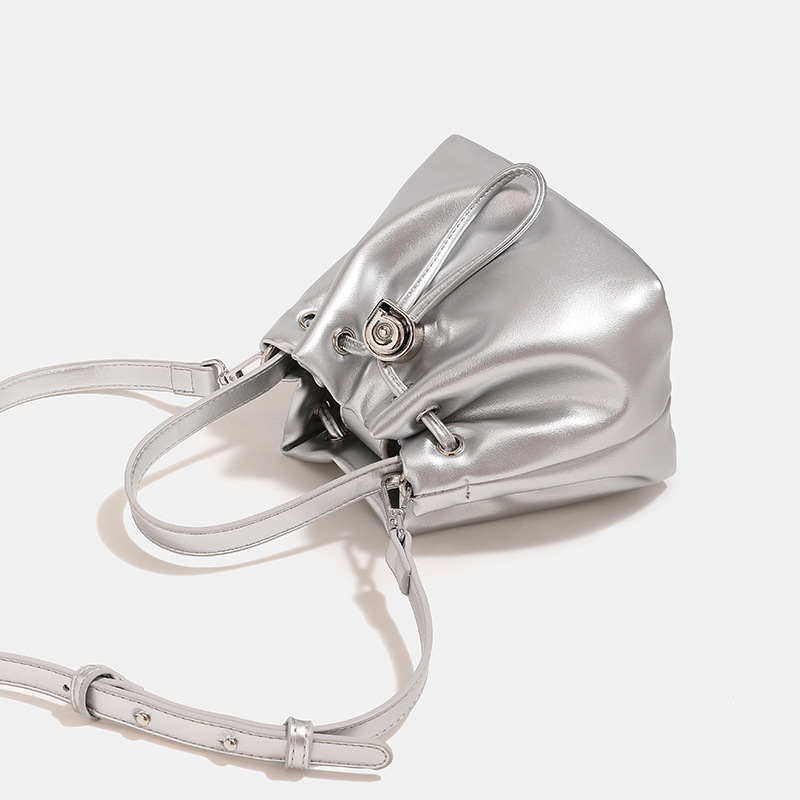 光沢のある上品な素材が美しい巾着タイプのショルダーバッグです。 コンパクトなサイズ感ながらも必需品はしっかり収納でき、デイリー使いに最適です。 巾着特有の丸みを帯びた柔らかなシルエットが女性らしさを演出します。 調節可能なショルダーストラップで肩掛けや手持ちなど様々なスタイルに対応できます。 金属のハトメとひも飾りがアクセントになった洗練されたデザインが魅力です。