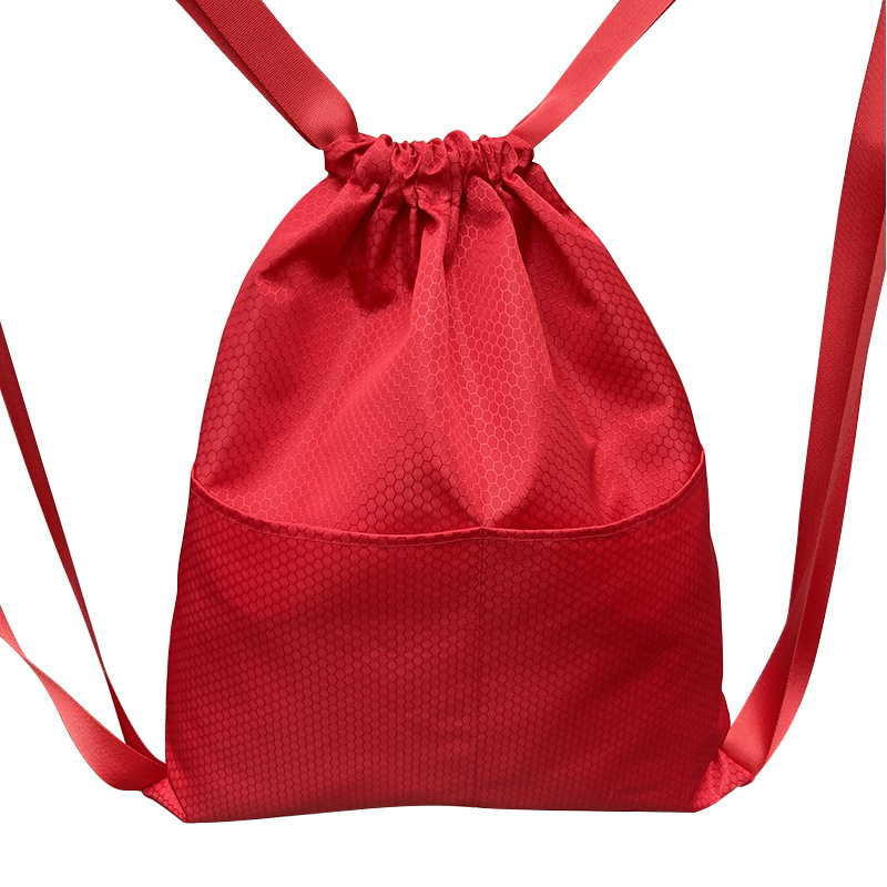 表面に蜂の巣のような立体的な六角形模様が施された軽量タイプの巾着リュックです。 口元はギャザーで絞られており、開閉が簡単で中身の出し入れもスムーズに行えます。 前面には便利なポケットが付いており、小物の収納に最適です。 幅広の肩紐は背負い心地が良く、長時間の使用でも疲れにくい設計となっています。 ジムやスポーツ、普段使いなど様々なシーンで活躍するリュックです。