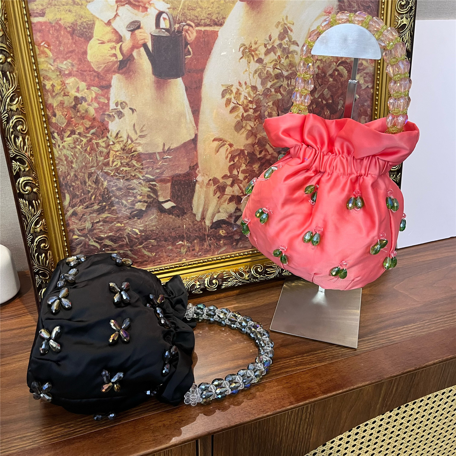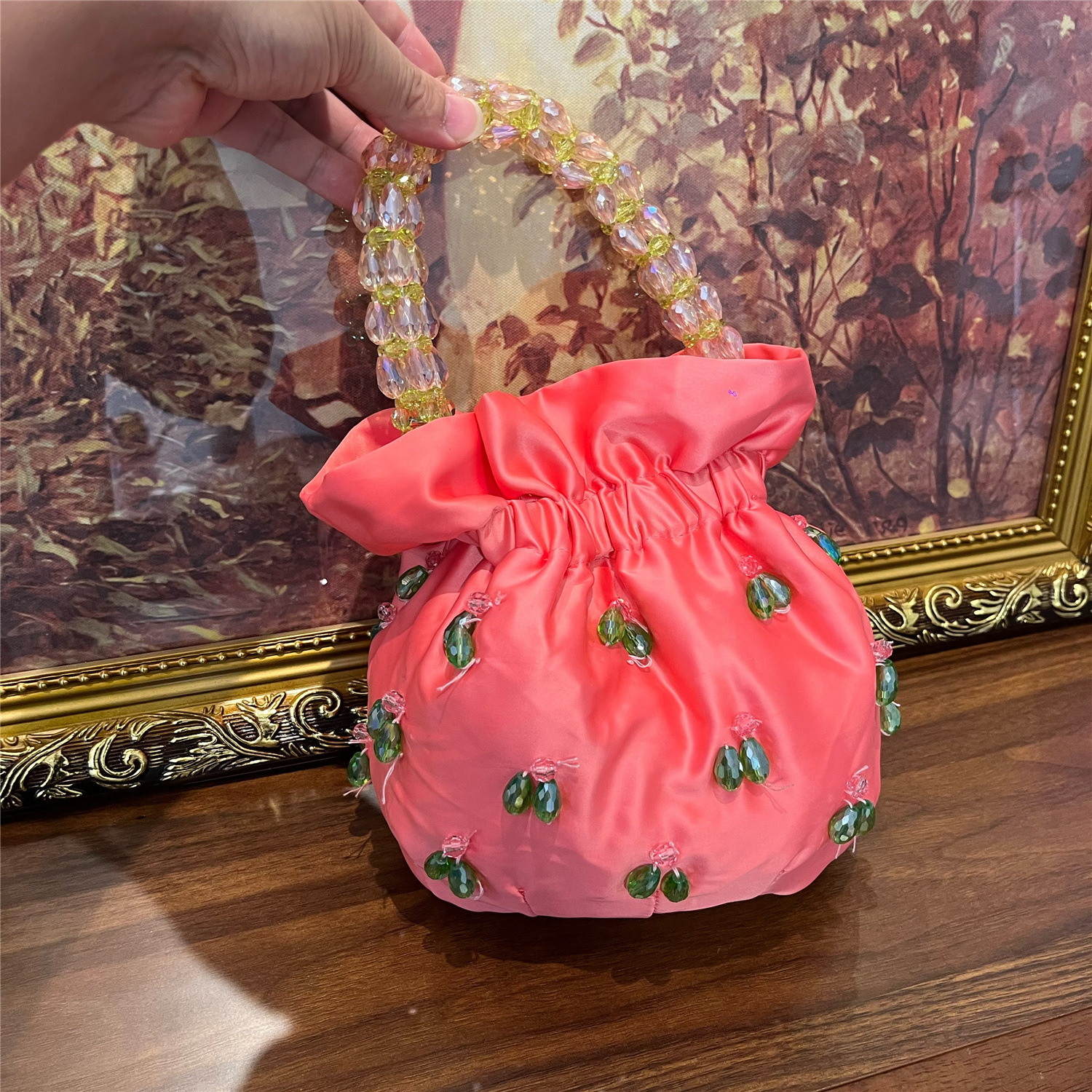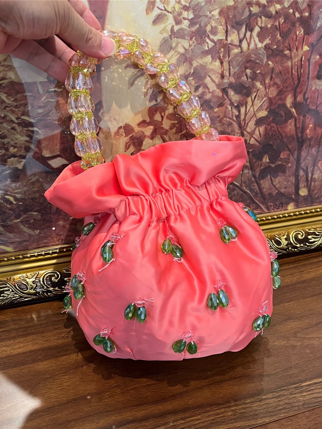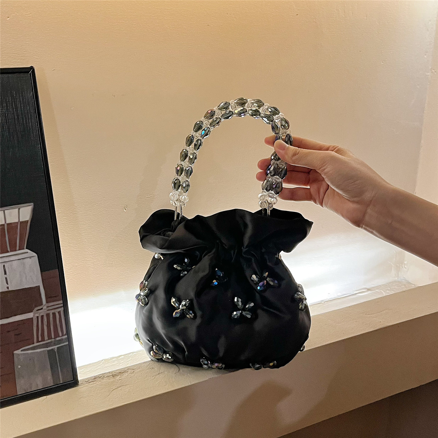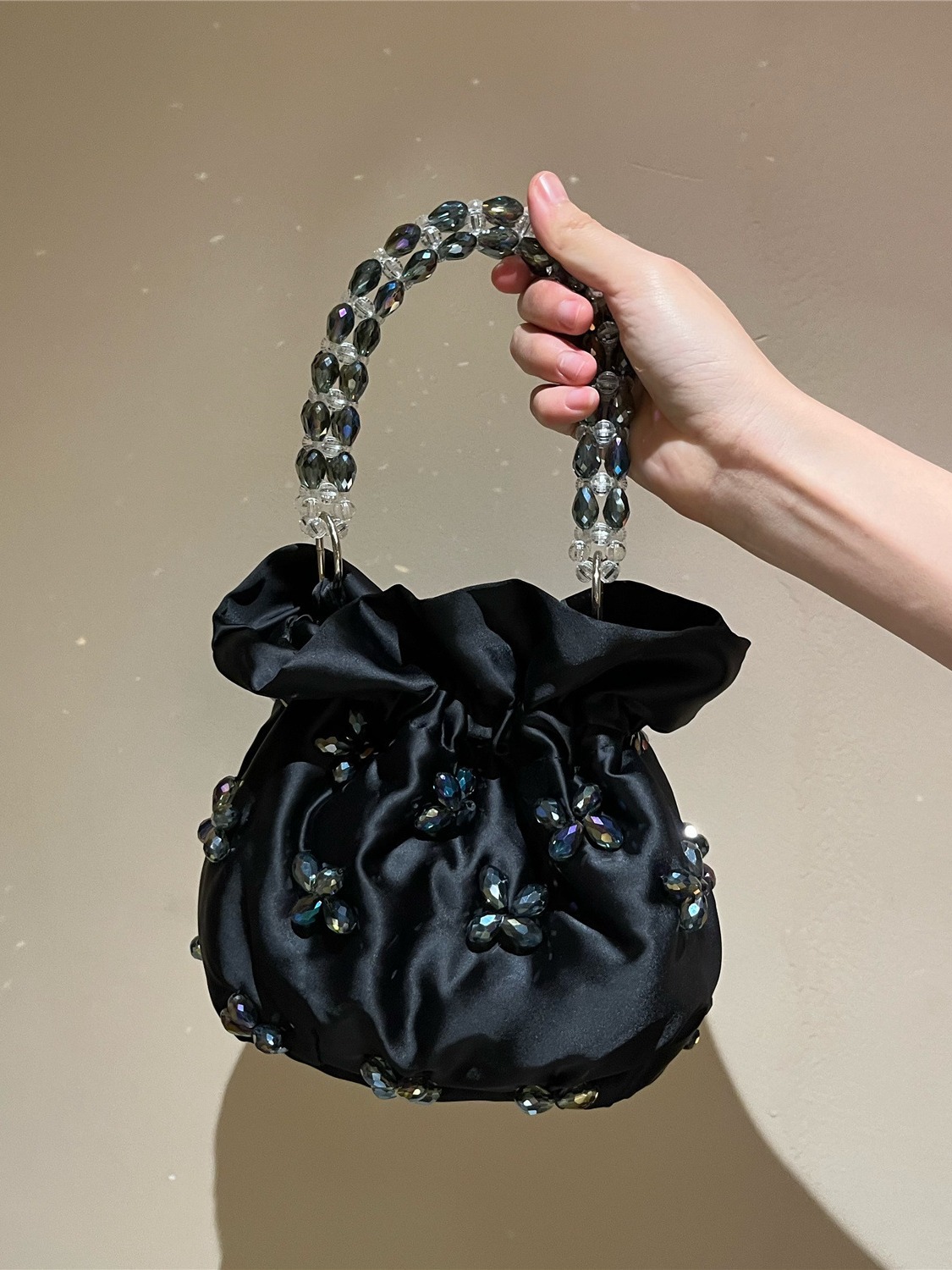 光沢のあるサテン生地に立体的なビジュー装飾を施した華やかな巾着タイプのトートバッグです。
