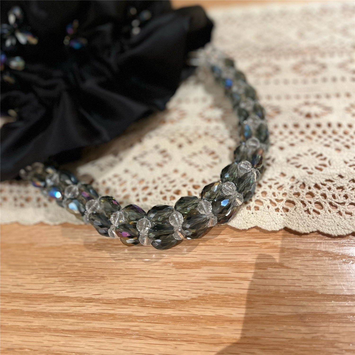持ち手部分には透明感のあるビーズを贅沢に連ねており、手元を美しく演出します。