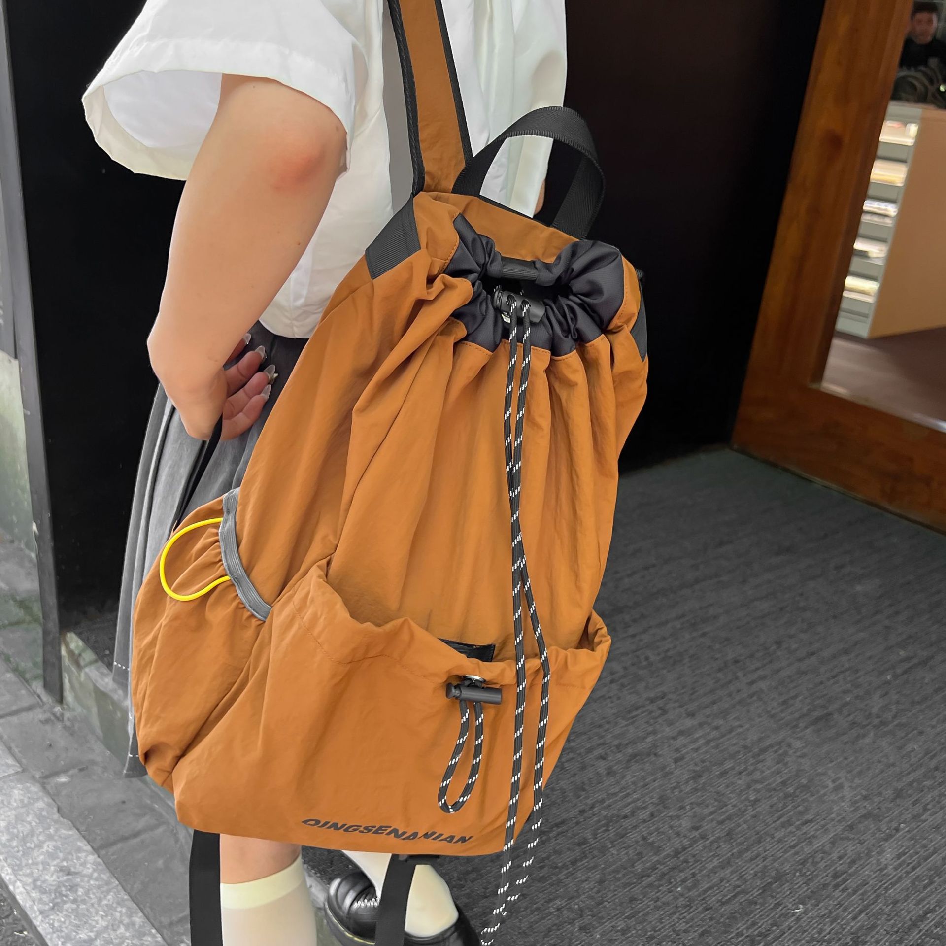 軽量なナイロン素材を使用した巾着仕様のトートバッグです。