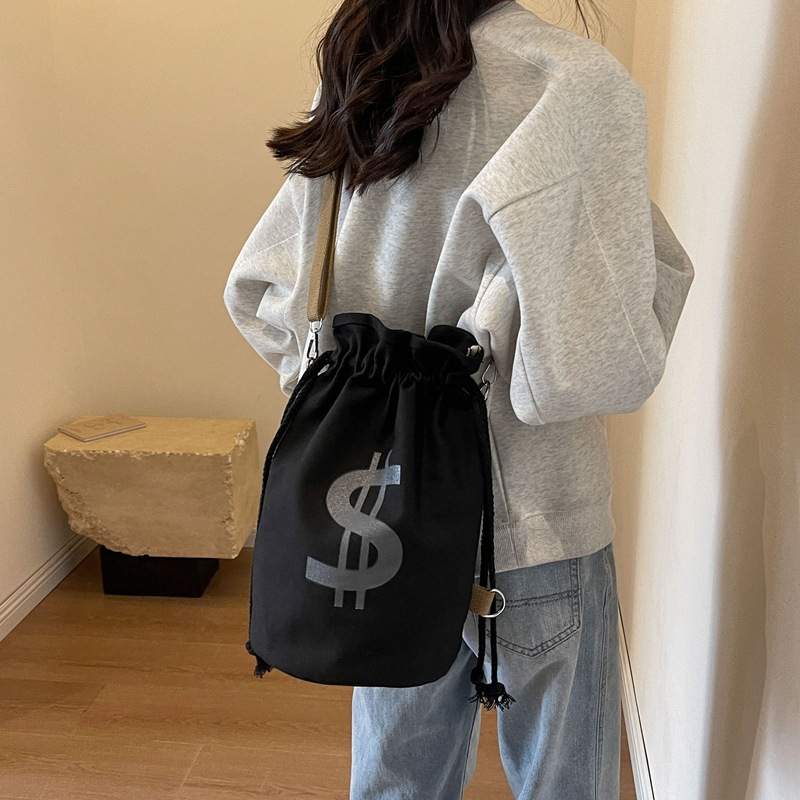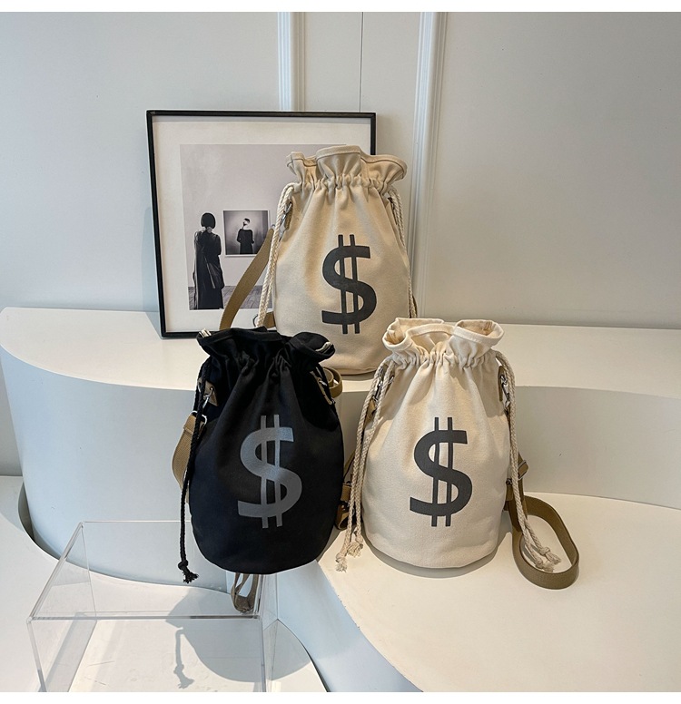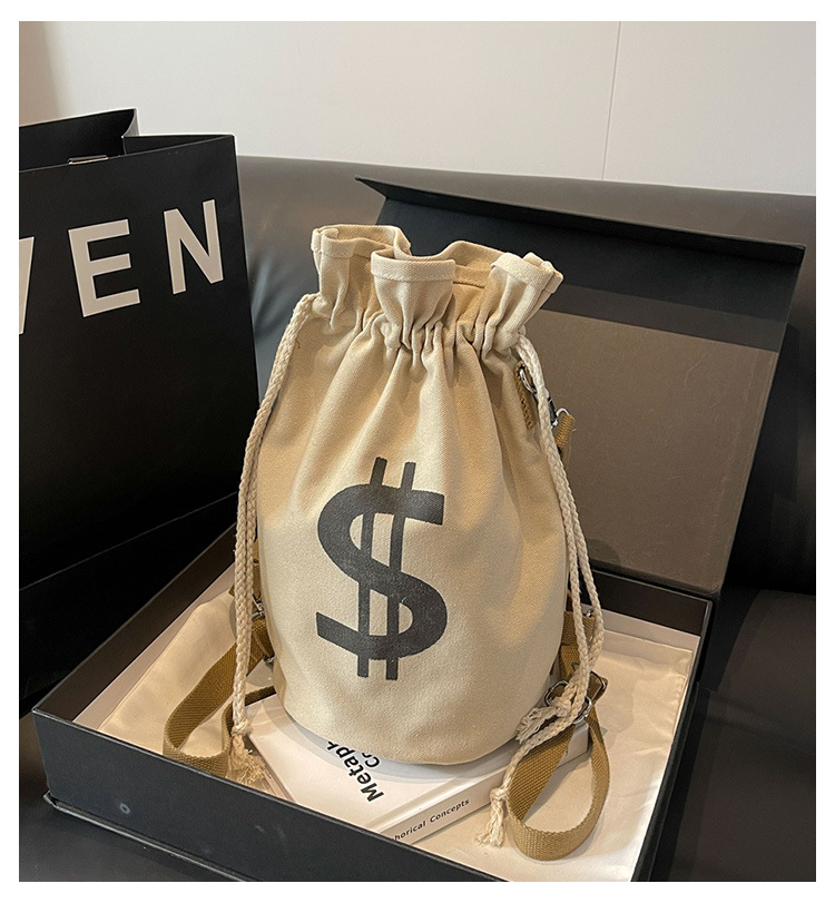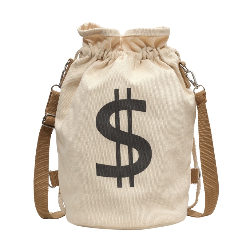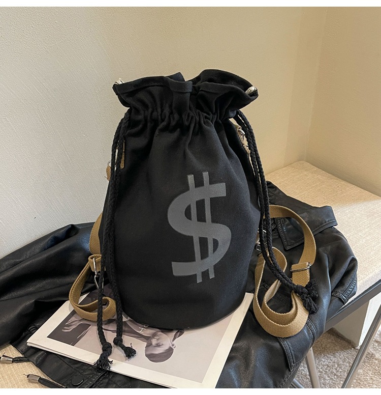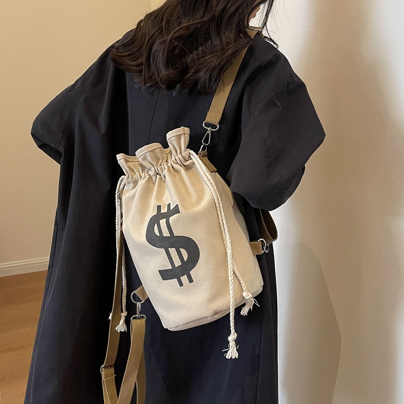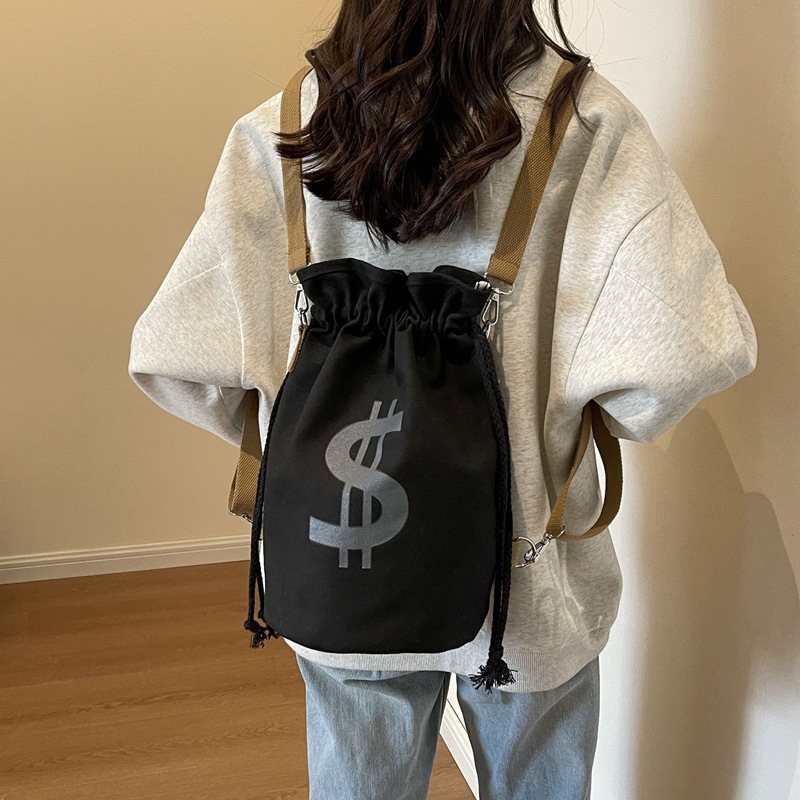 個性的なドル記号のプリントが目を引く巾着タイプのリュックです。