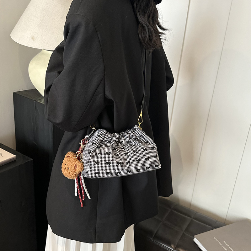 可愛らしいふわふわチャームが付いており、個性的なアクセントになります。