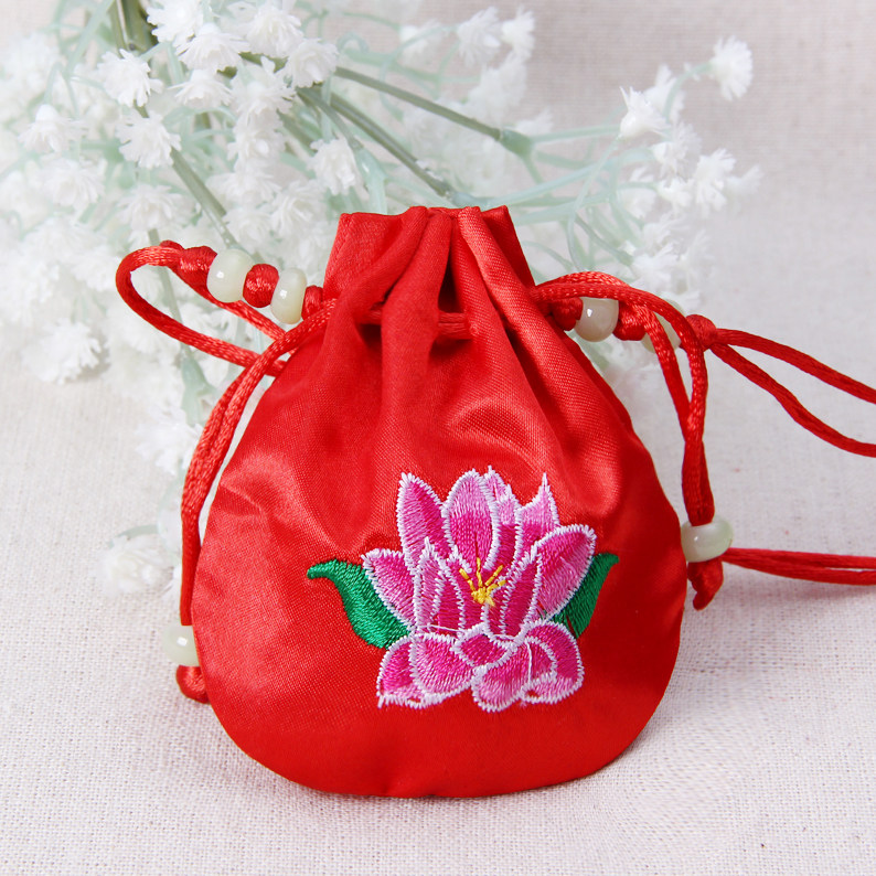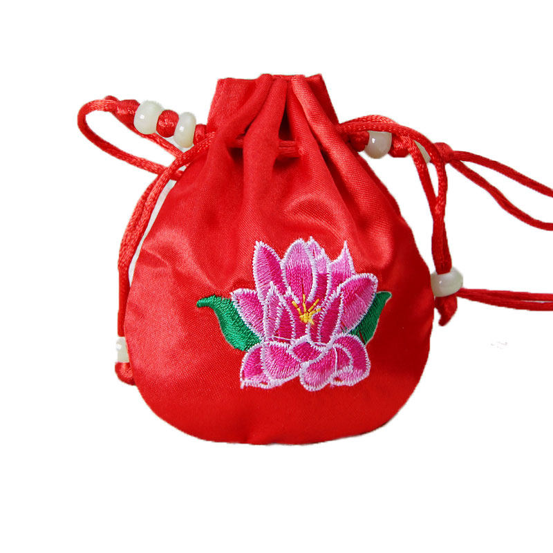 光沢のあるサテン調の生地に美しい刺繍が施された和風デザインの巾着ポーチです。 蓮の花や漢字の刺繍が華やかで、お祝い事やギフトにも最適です。 紐を絞るだけで簡単に開閉でき、小物やアクセサリーの収納に便利なポーチとして活躍します。 コンパクトなサイズ感で持ち運びやすく、和装にも洋装にも合わせやすいデザインが魅力です。 大切な小物を上品に保管できる巾着タイプの実用的なアイテムです。