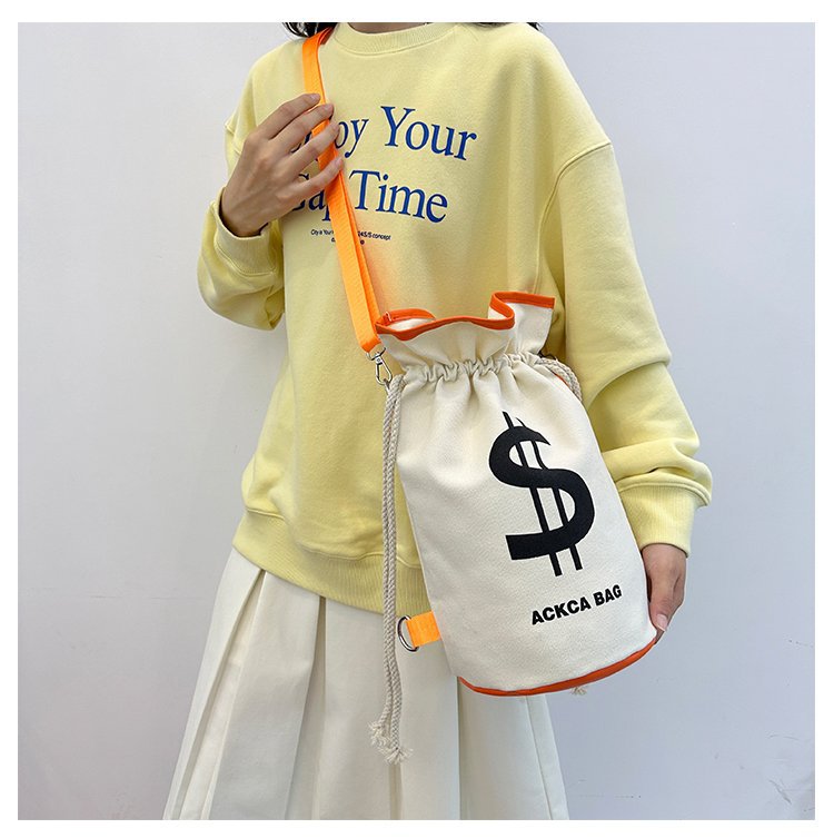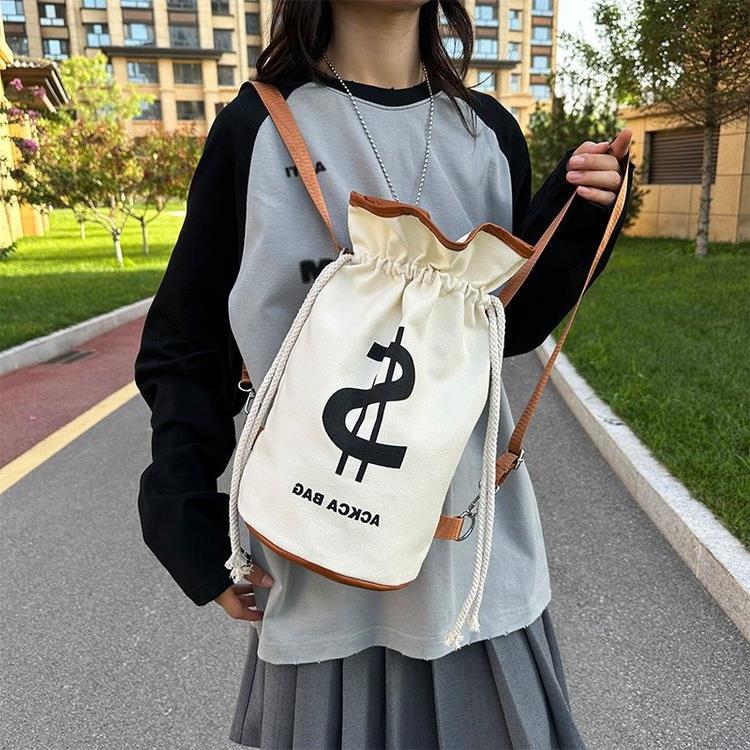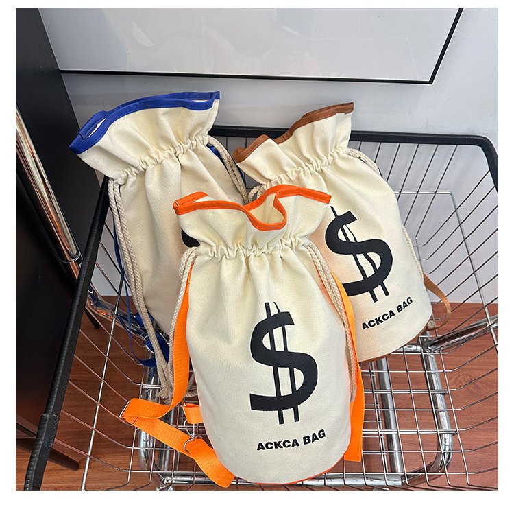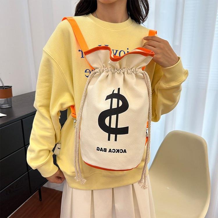 インパクトのあるドル記号がプリントされた個性的な巾着デザインのリュックです。