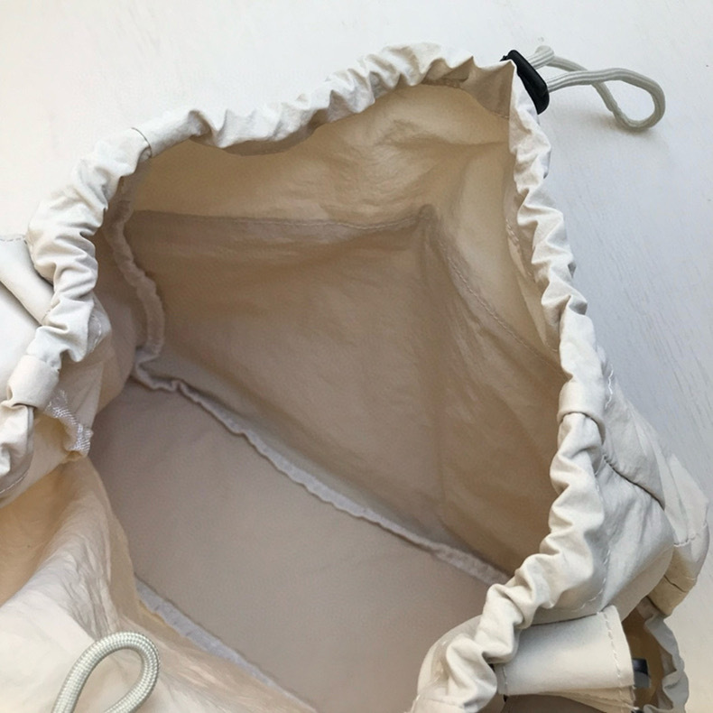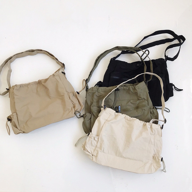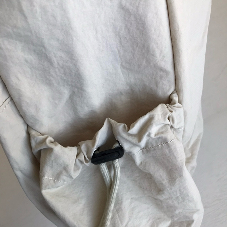 開口部は巾着仕様で中身をしっかり守り、フロントのファスナーポケットが小物収納に便利です。