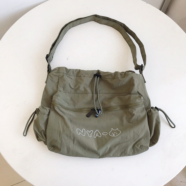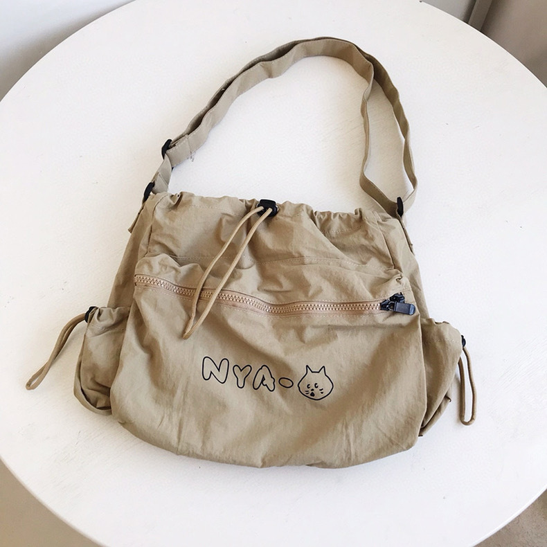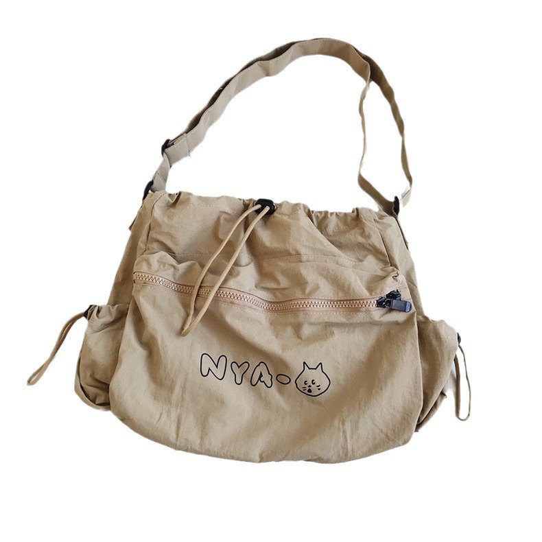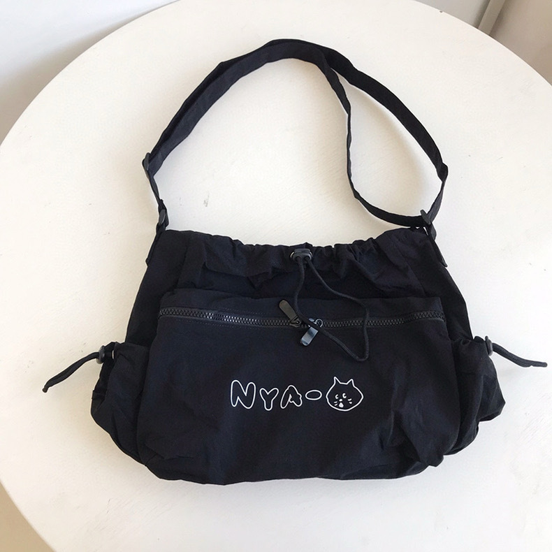 可愛らしい猫のイラストとロゴが刺繍された巾着タイプのトートバッグです。 開口部は巾着仕様で中身をしっかり守り、フロントのファスナーポケットが小物収納に便利です。 軽量で柔らかな素材を使用しており、デイリー使いに最適なカジュアルデザインです。 ショルダーストラップ付きで肩掛けスタイルも楽しめます。 普段使いからお出かけまで幅広く活躍するトートバッグです。