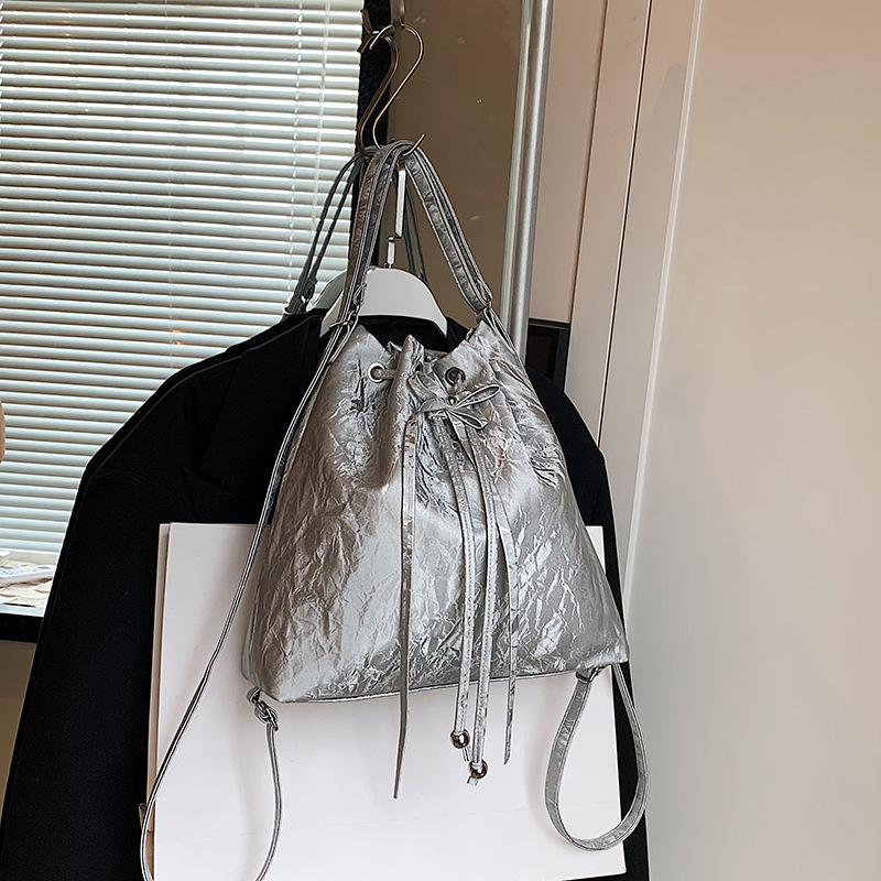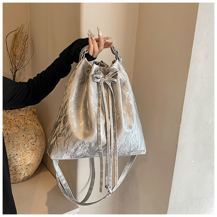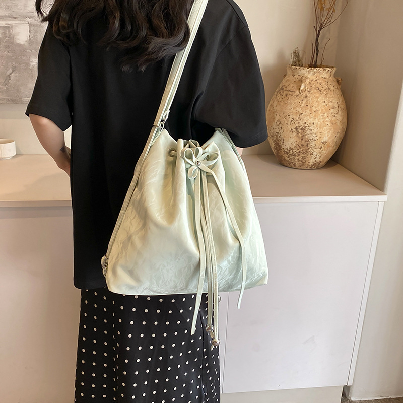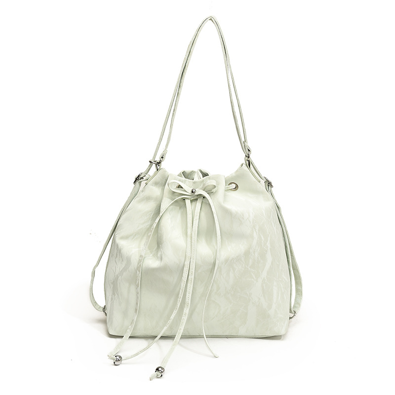 丸みのある巾着型のシルエットが優しい印象を与え、紐で絞るデザインが可愛らしさをプラス
