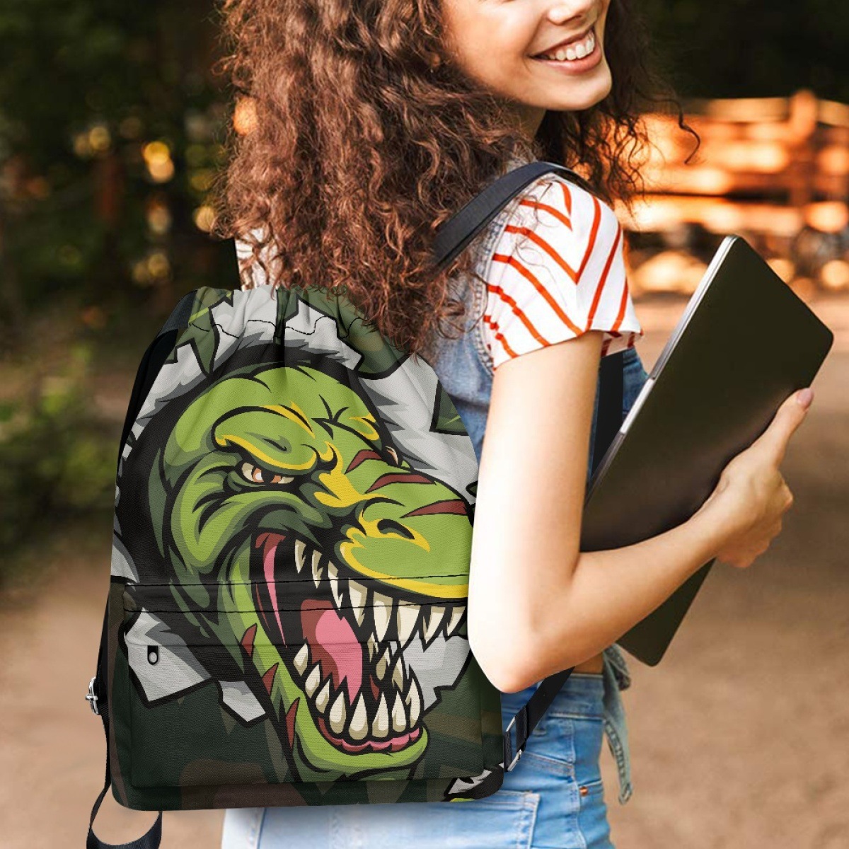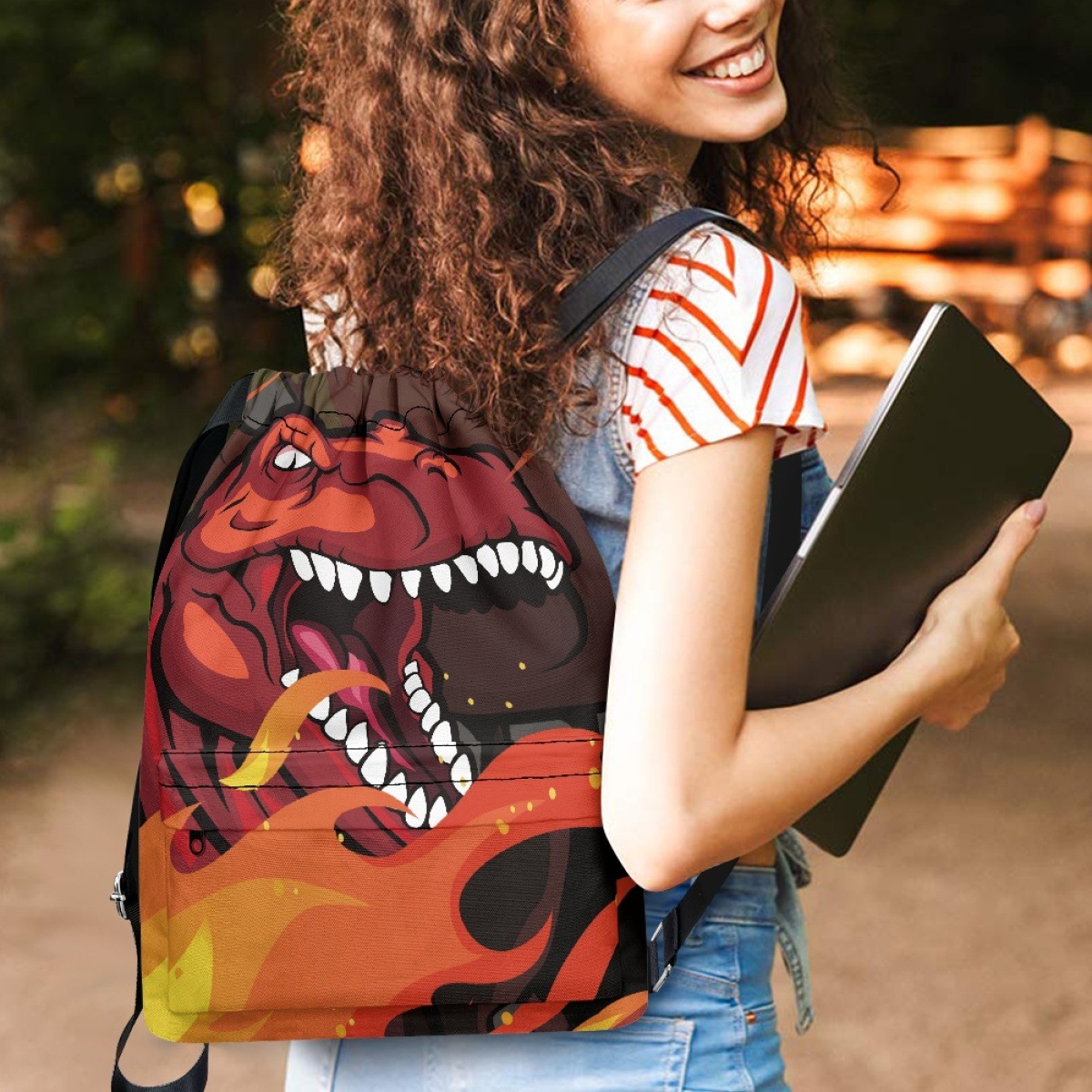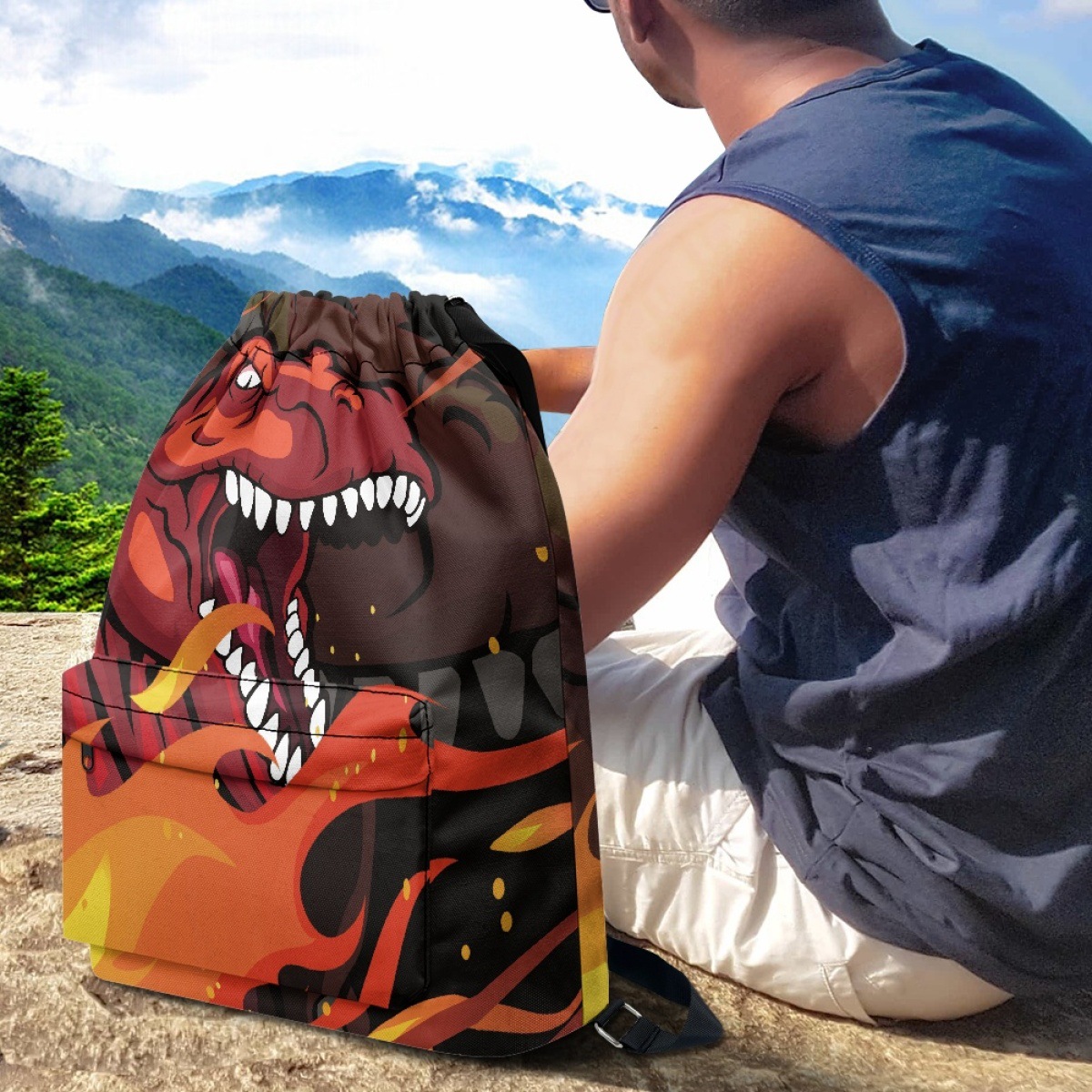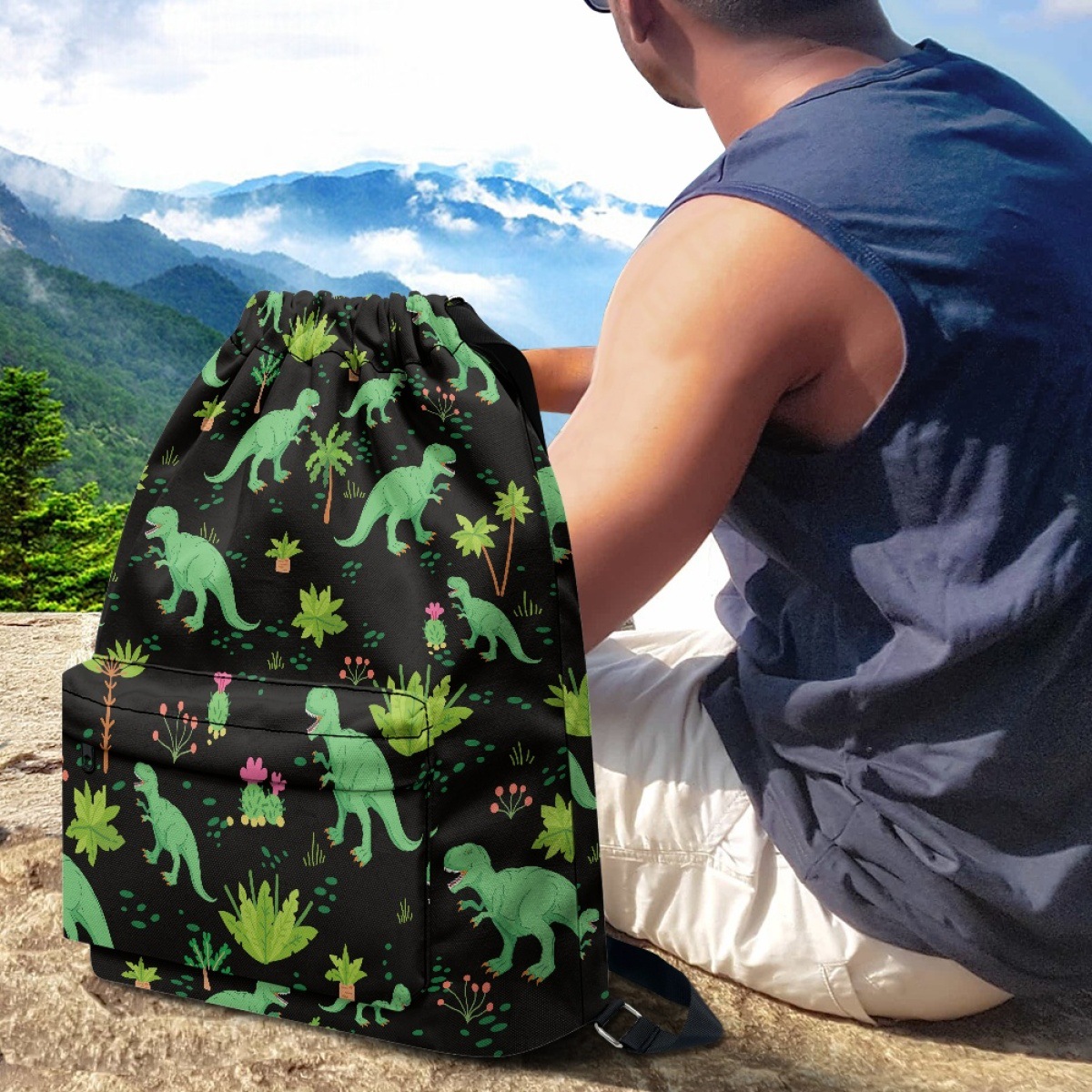 恐竜と熱帯植物が描かれた楽しいデザインの巾着リュックです。 軽量で開閉しやすい巾着タイプなので、普段使いや遠足、体育の授業などにも最適です。 リュックの両サイドには丈夫な肩紐が付いており、背負い心地も快適です。 お子様から大人まで幅広くお使いいただける可愛らしいアイテムです。 サイドポケット付きで小物の収納にも便利な機能性も兼ね備えています。